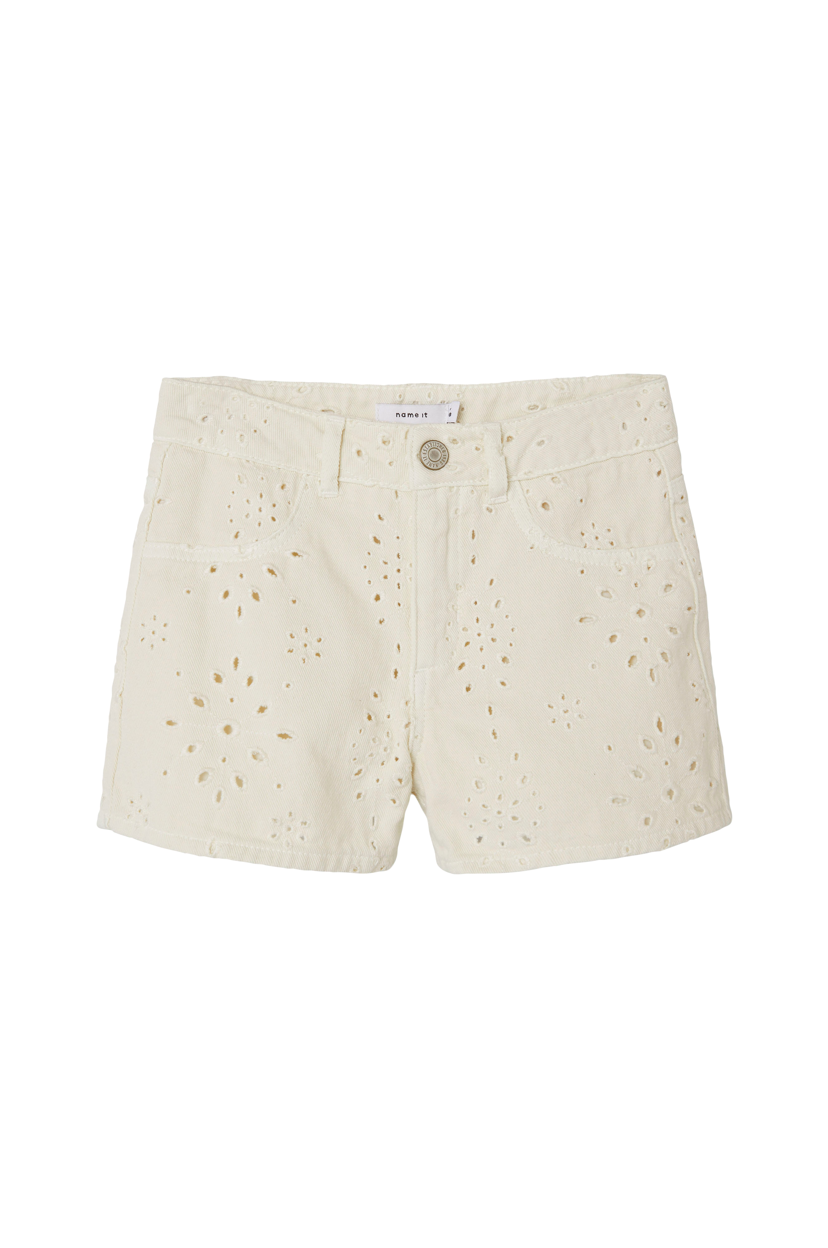 • Shorts i bomullstwill med broderat hålmönster• Fuskfickor fram• Bakfickor• Justerbar midja• Dragkedjegylf• Vävt foder