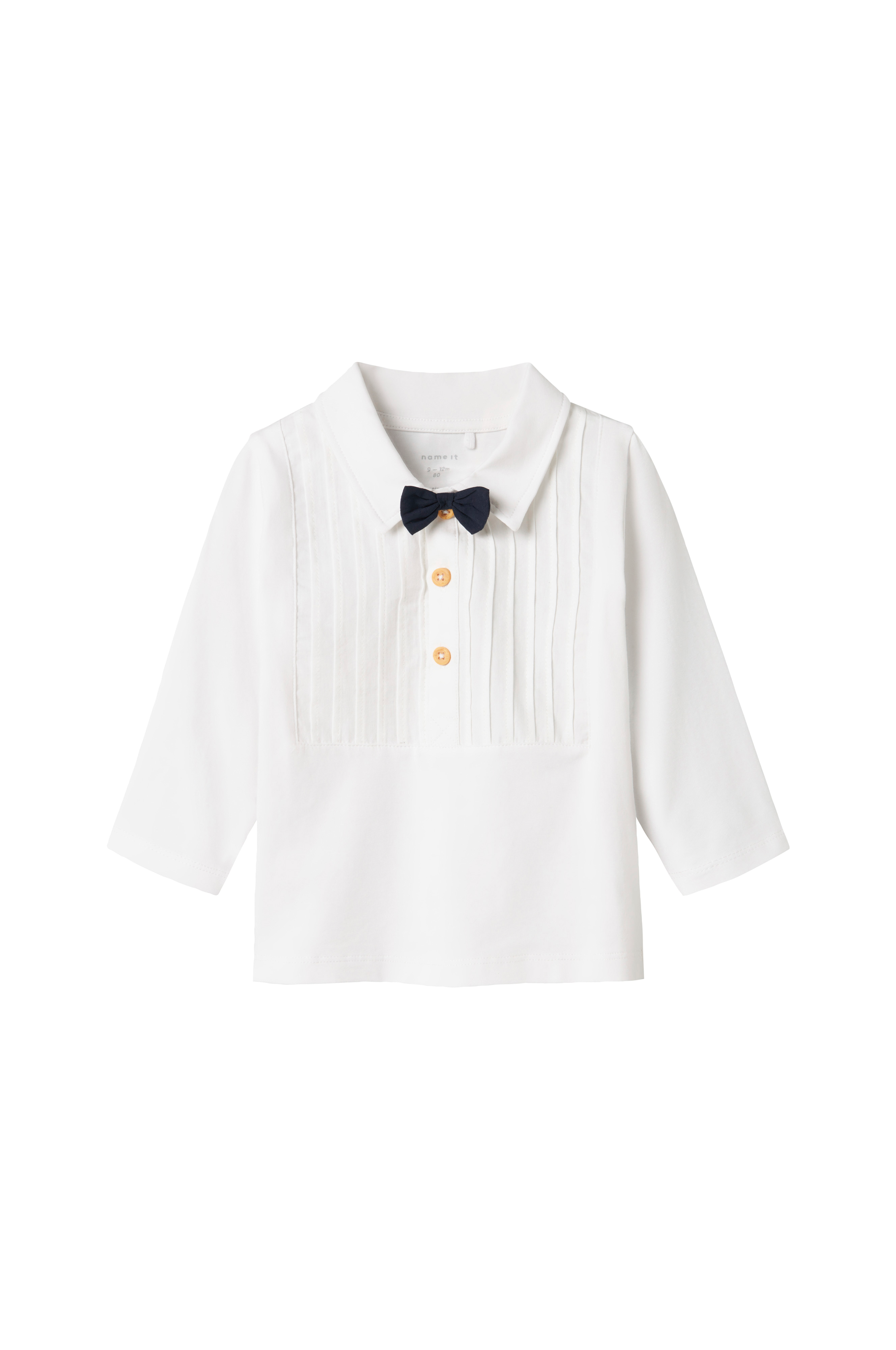 • Långärmad t-shirt• Krage• Påsydd rosett• Stråveck upptill fram• Tre knappar
