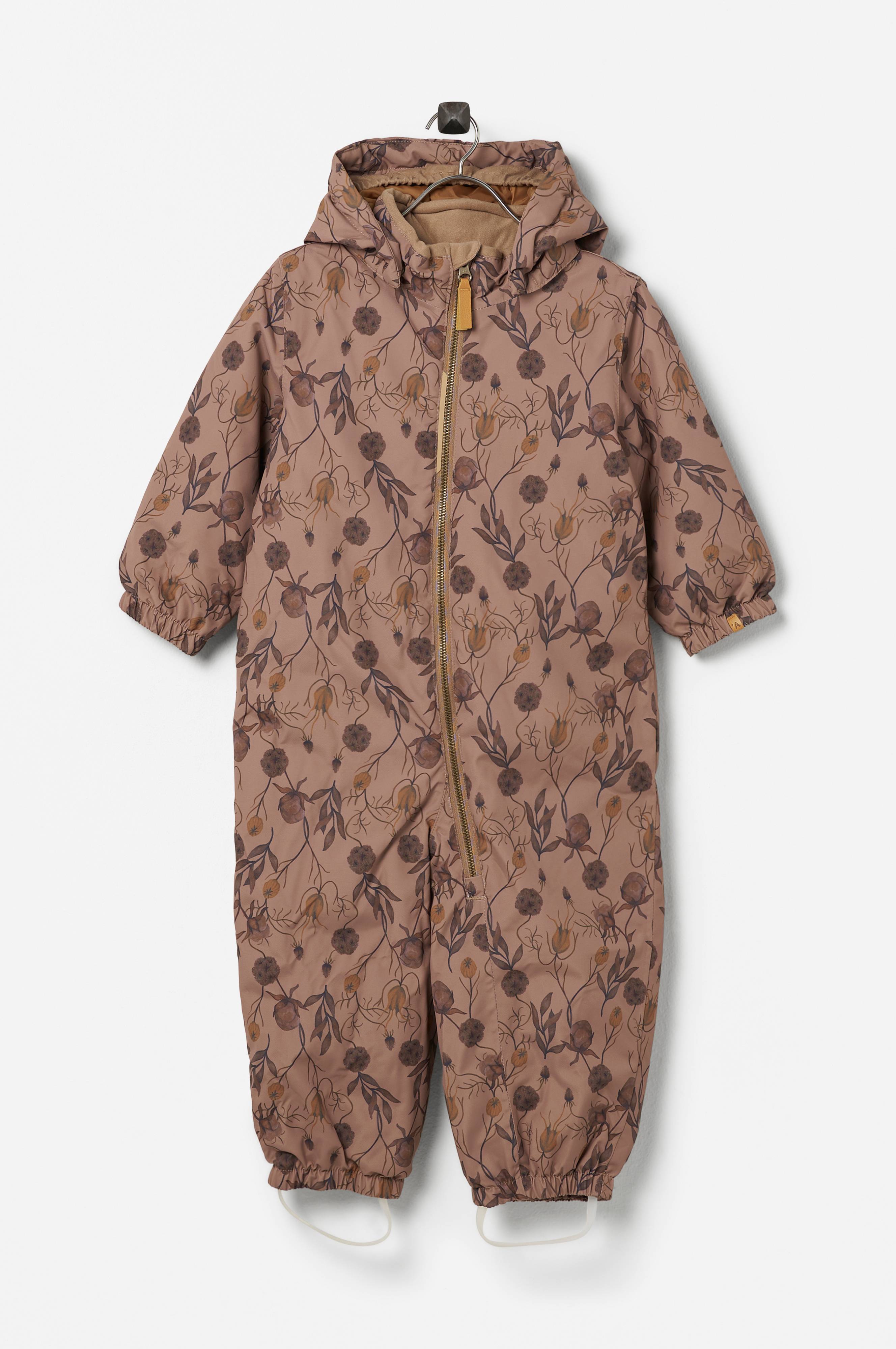 Avknäppbar huva med resår i framkanten. Hög krage med mjuk, borstad trikå på insidan. Stängning med dragkedja. Resår i midjan bak. Resår i ärmslut och benslut. Elastiska, avtagbara fothällor.
