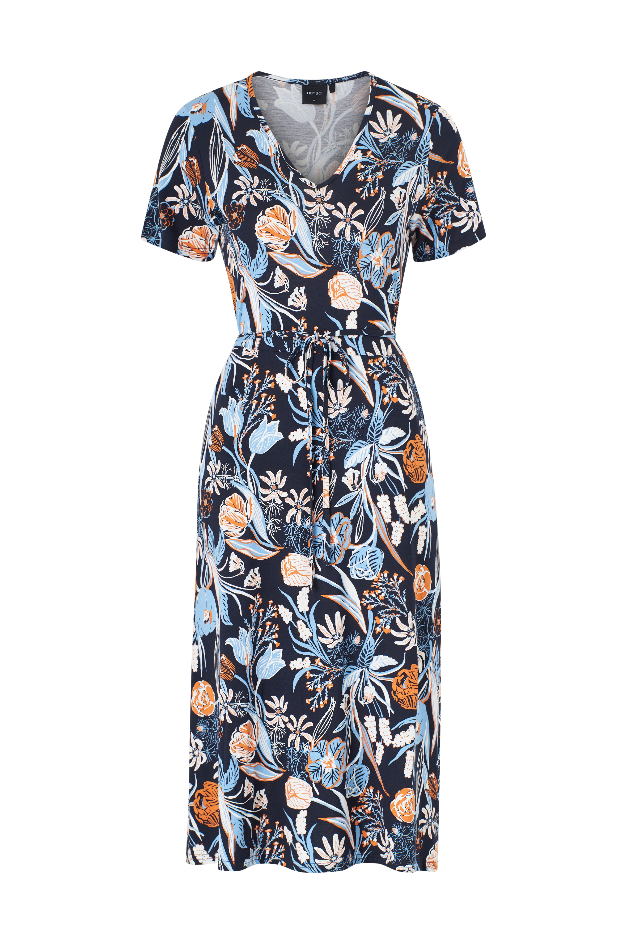 • Blommönstrad klänning med knytband i midjan