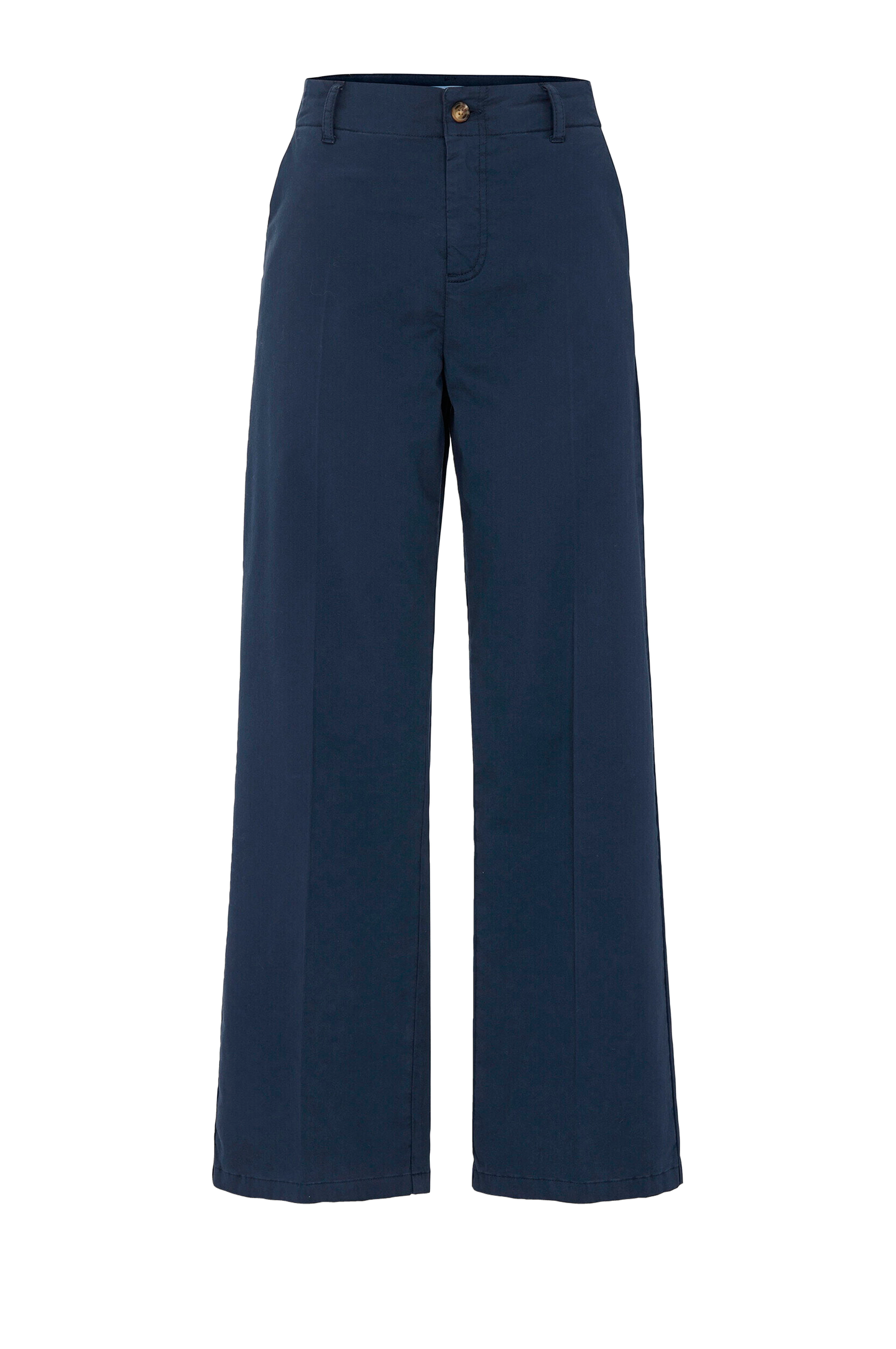 Byxor tillverkade av bomulls- och elastansatin med mjuk glans och skön stretch. Designad med normal midja och vida ben för en balanserad silhuett. Avslutad med snedställda sidofickor, pressveck fram och en knapp i hornimitation för en klassisk touch.