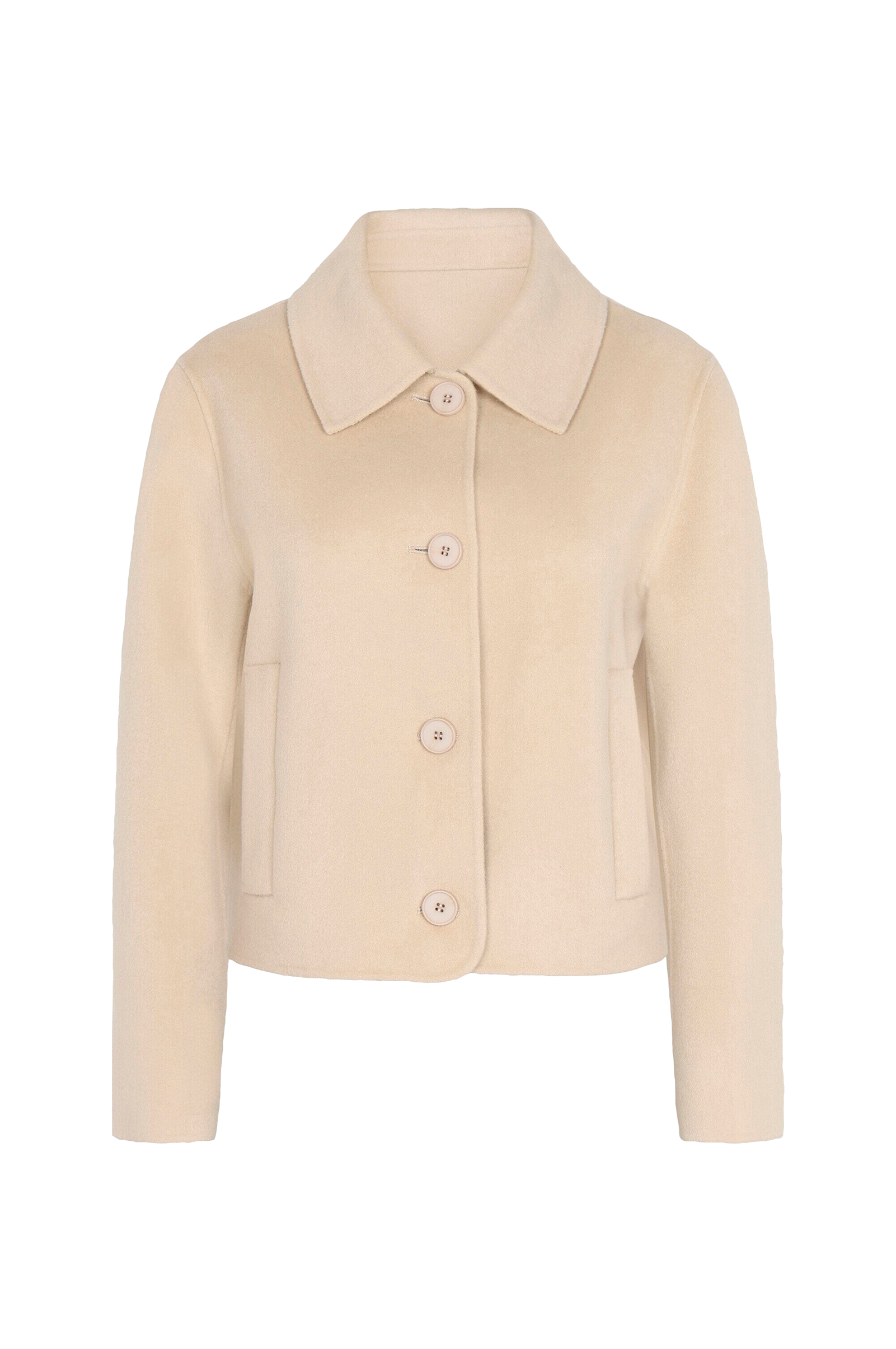 Kort kavaj tillverkad av dubbelfasad ull, vilket ger ett lätt och mjukt plagg med raffinerad struktur. Designad med krage, sidofickor och tonade knappar för en ren, tidlös look.