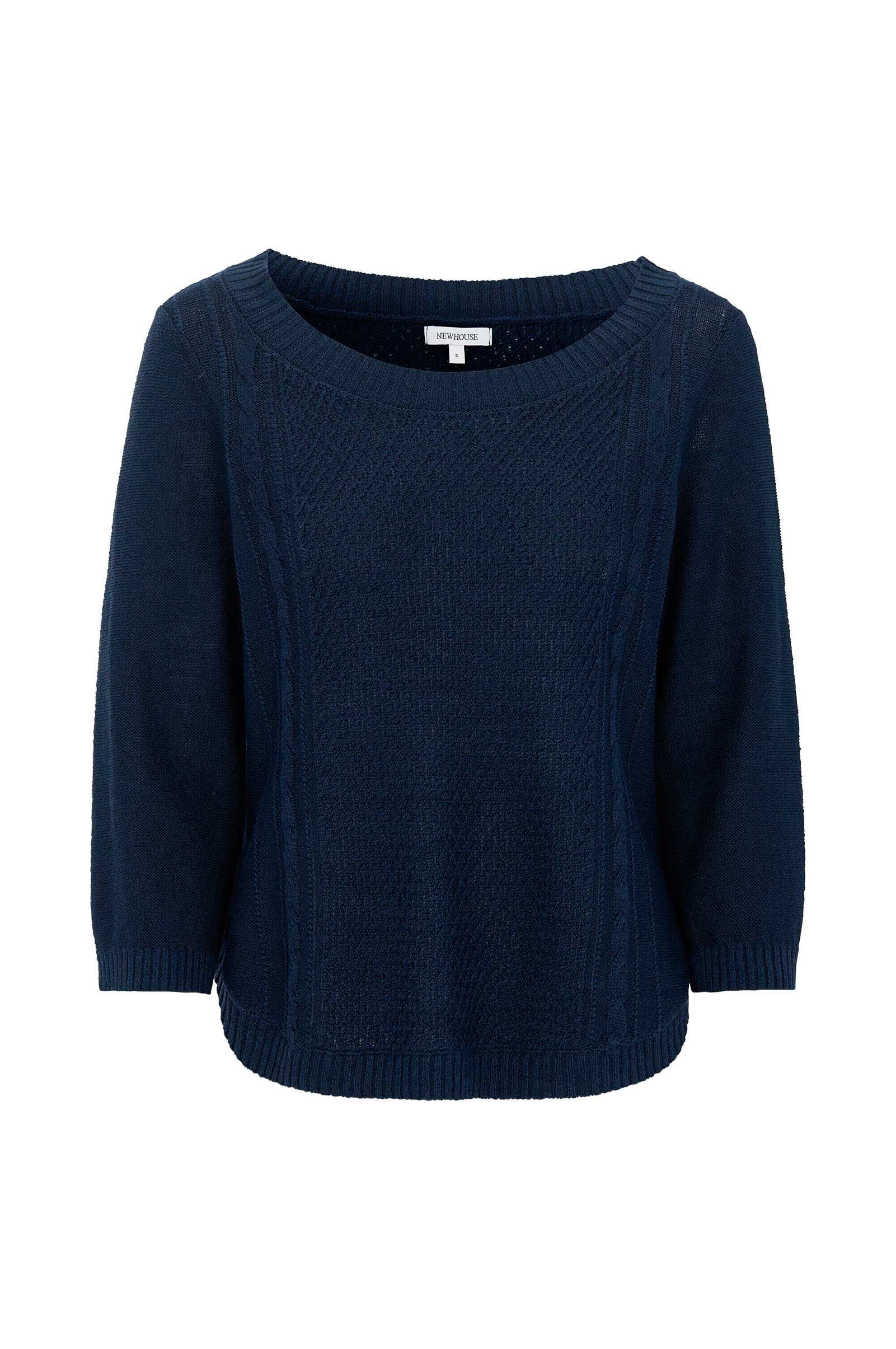 Stickad tröja i en linne- och bomullsblandning, tillverkad i 9-gauge för en raffinerad passform. Designad med kabelmönster på kroppen och omvända stickade ärmar för en subtil kontrast i texturen. Avslutad med ribbade avslut.