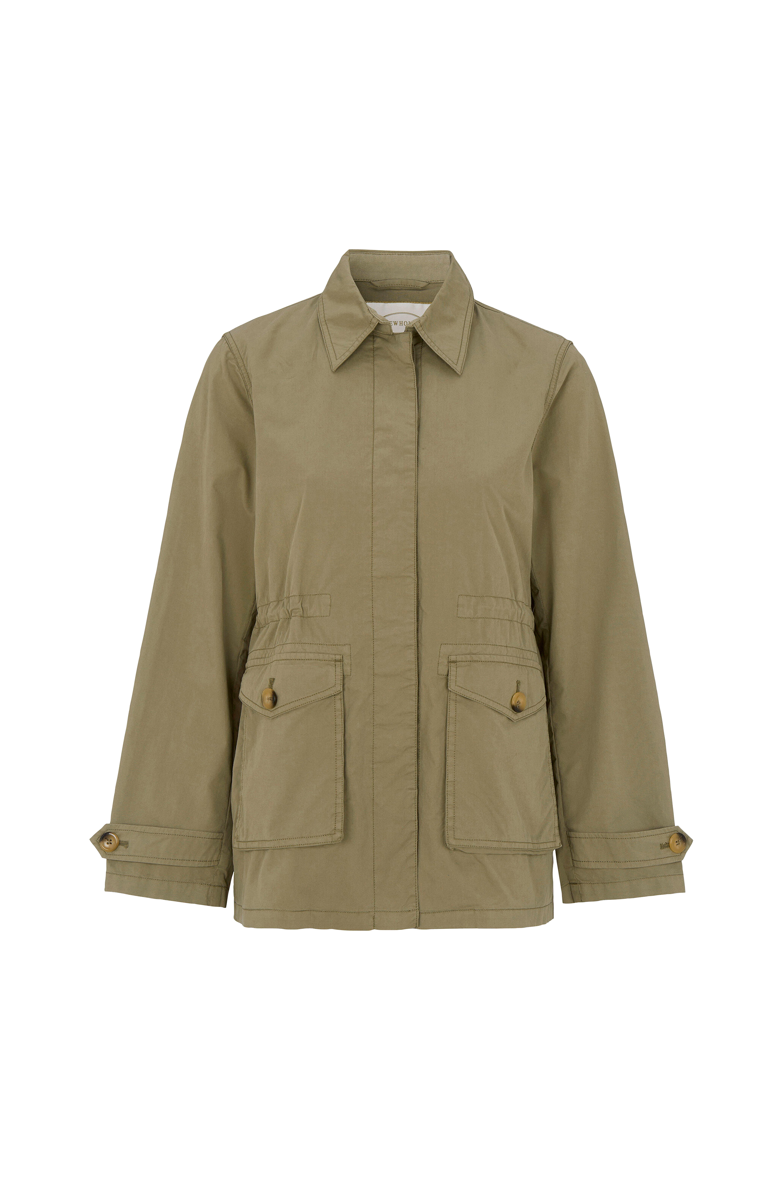 Safarijacka med välarbetade detaljer som påsydda fickor med lock och knappar, dragsko i midjan och flikar i ärmsluten.