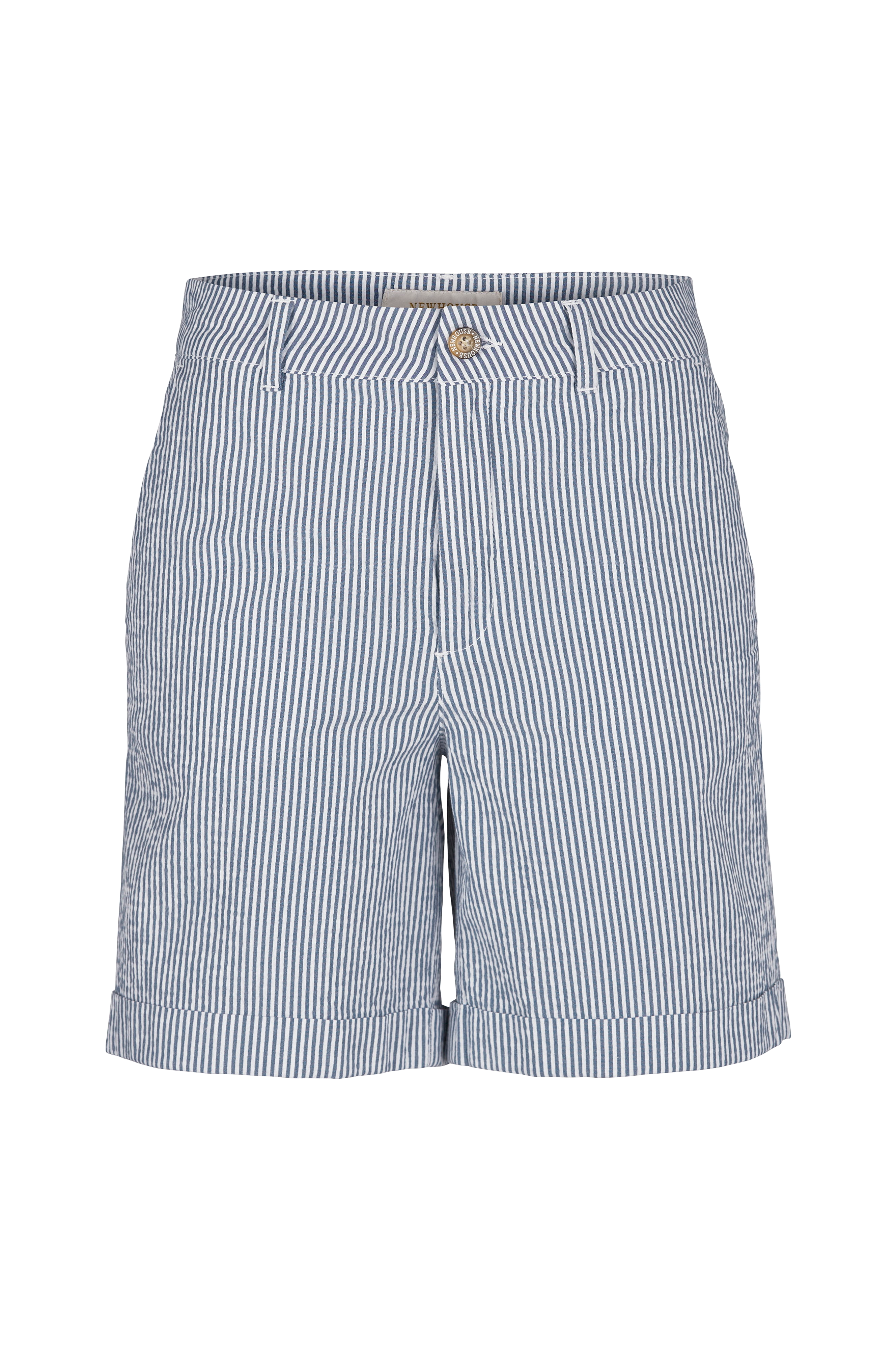 Smarta bomullsshorts i randig seersucker. Shortsen har en liten uppvikning på benet, med knappknäppning.