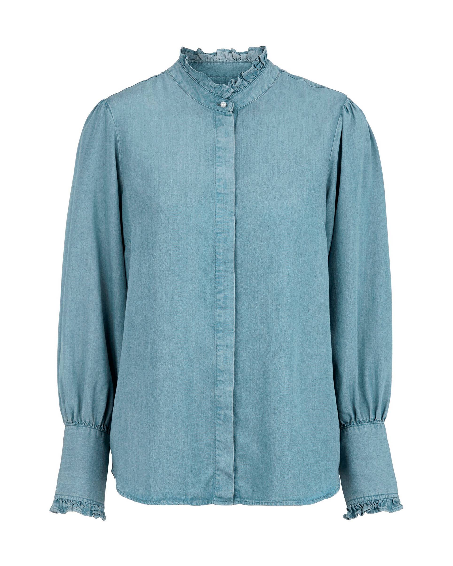 Skjorta tillverkad av indigofärgat tencel™-tyg med en mjuk, flytande känsla. Designad med en smal passform och en krage med volanger för en feminin touch. Ärmarna har en subtil puff-effekt och avslutas med pärlknappar vid manschetterna, som återkommer vid kragen.