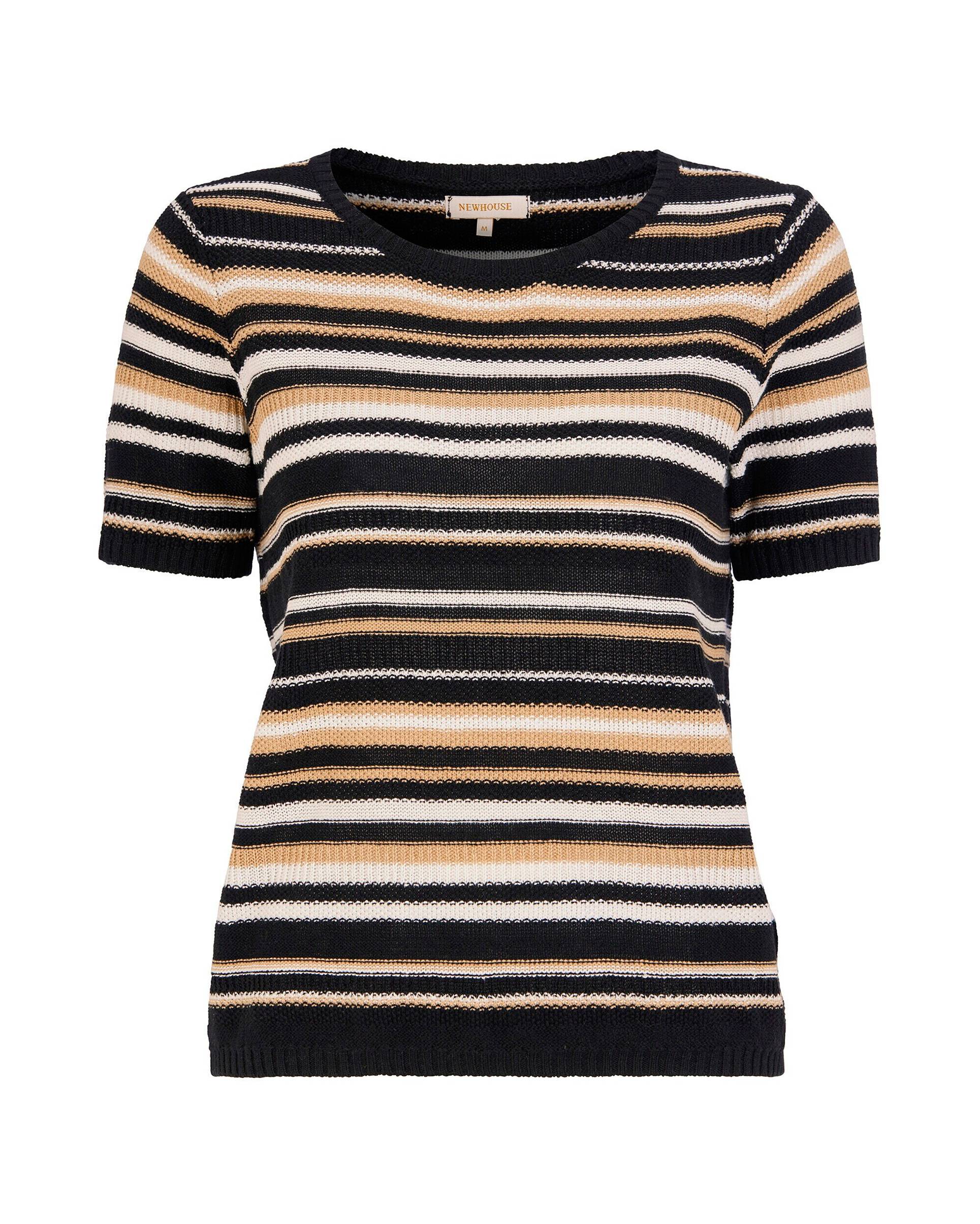 Stickad topp med korta ärmar och rund halsringning. Avslutad med ribbade avslut och en randig struktur som kombinerar olika sticktekniker. Tillverkad i en bomulls- och linneblandning för en lätt och naturlig känsla.