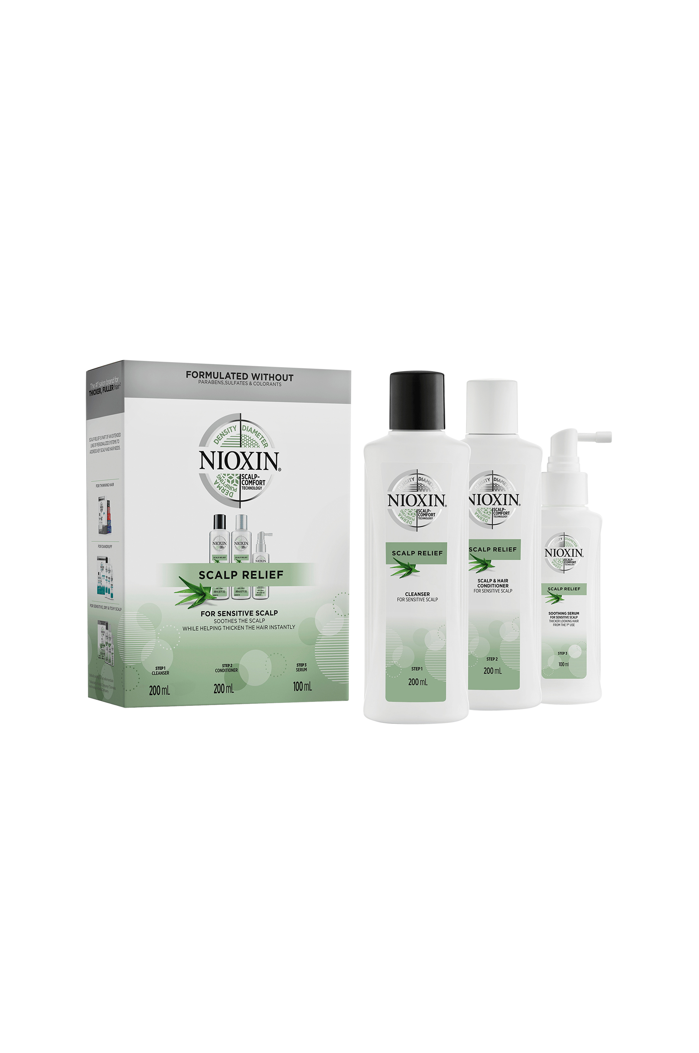 Set för känslig, torr och irriterad hårbotten. Nioxin Scalp Relief är en komplett och skonsam hårbotten- och hårvårdsrutin i tre steg, inspirerad av hudvård: