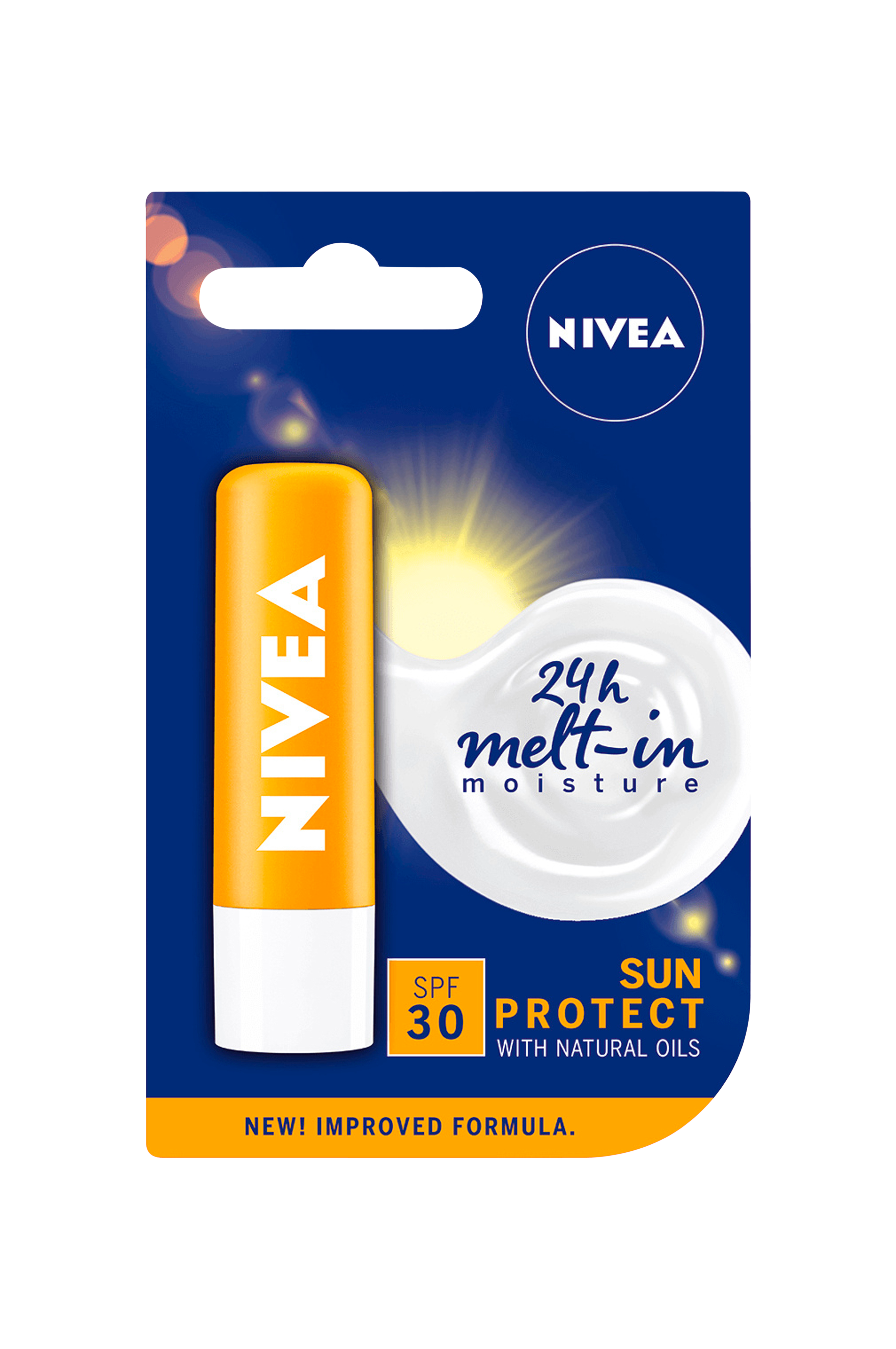 Nivea Sun Protect med SPF 30 både vårdar och skyddar din läppar från solens strålar. Ger intensivt skydd för den känsliga huden på dina läppar. Skyddar både mot UVA- och UVB-strålar. Den unika formulan berikad med naturliga oljor och sheasmör smälter direkt på läpparna och ger omedelbart skydd för den känsliga huden. Applicera med jämna mellanrum för ett varaktigt skydd. Njut av solen med Nivea Sun Protect för mjuka och skyddade läppar! Kliniskt testad.