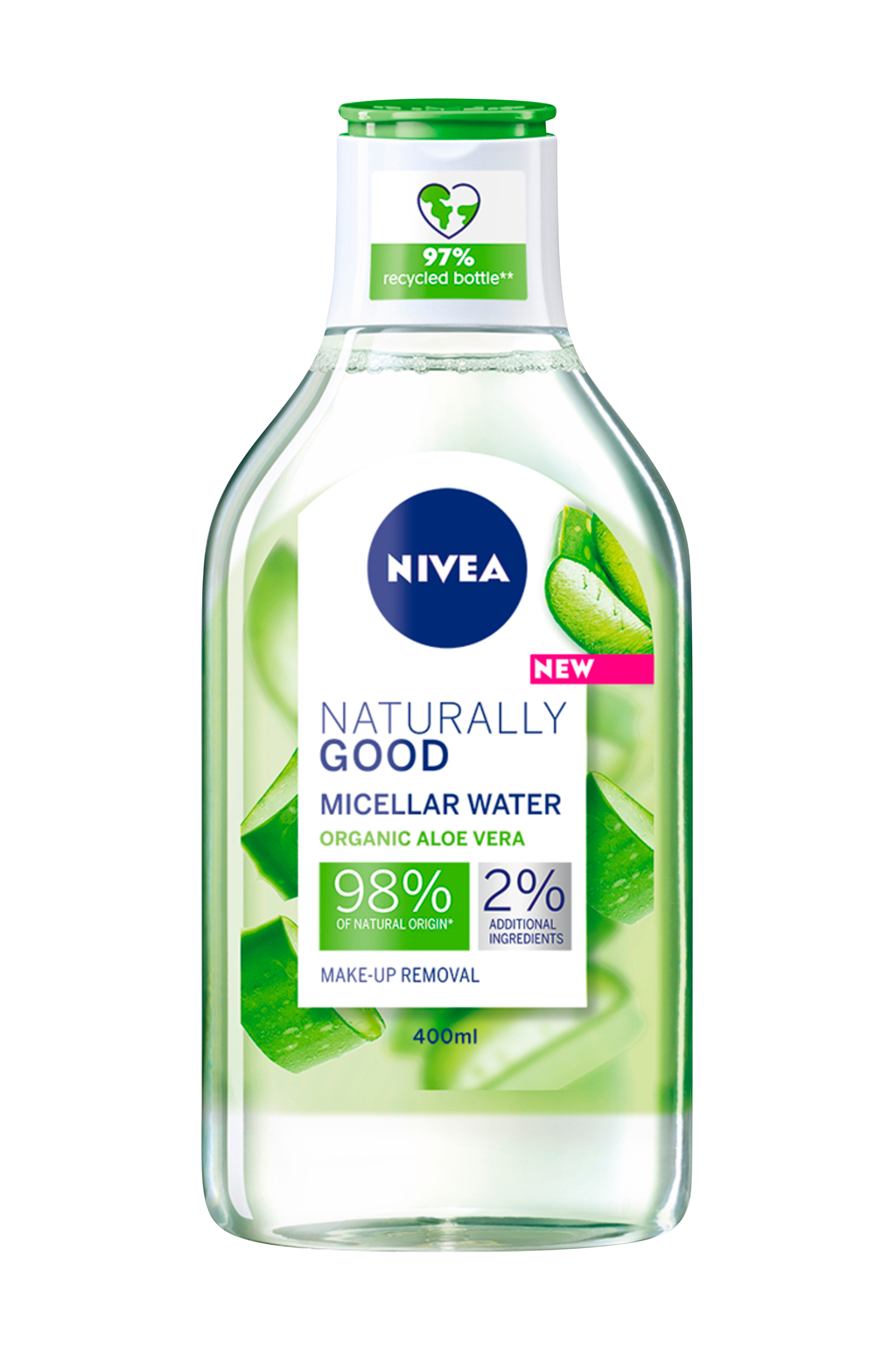 Nivea Naturally Good Micellar Water med ekologisk aloe vera består av 98% naturliga ingredienser och övriga 2% säkerställer maximal trygghet för din hud. Den uppfriskande formulan tar bort makeup och rengör effektivt och vårdande. Formulan fungerar likt en magnet som effektivt fångar upp envist smink, talg och smuts. Resultatet är en ren och återfuktad hud som kan andas. Dermatologiskt och oftalmologiskt testad. Passar alla hudtyper.