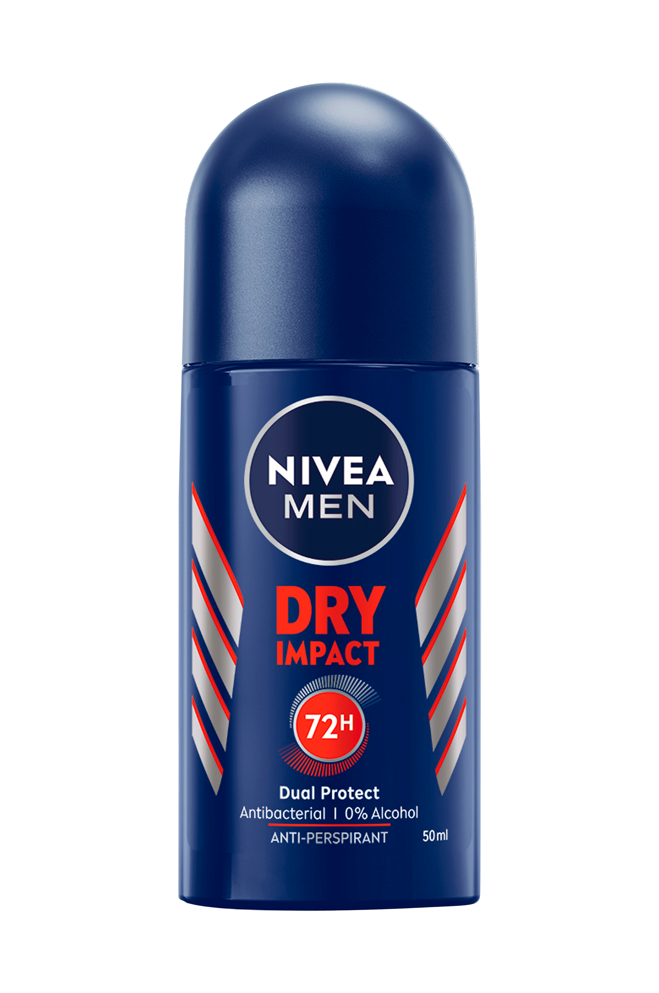 Nivea Men Dry Impact antiperspirant roll-on ger dig kraftfullt skydd testad i de verkliga livet. Eftersom verkliga livet inte uppstår i labbet har Nivea Dry testats med en helt ny testteknologi som visar att deodoranten även klarar det tuffaste testet: Livet. Nivea Dry är utvecklad och testad med en smart sweat tracking-t-shirt. Nivea Dry Impact har 48 timmars pålitligt skydd mot svett och kroppslukt men är samtidigt skonsam mot din hud.