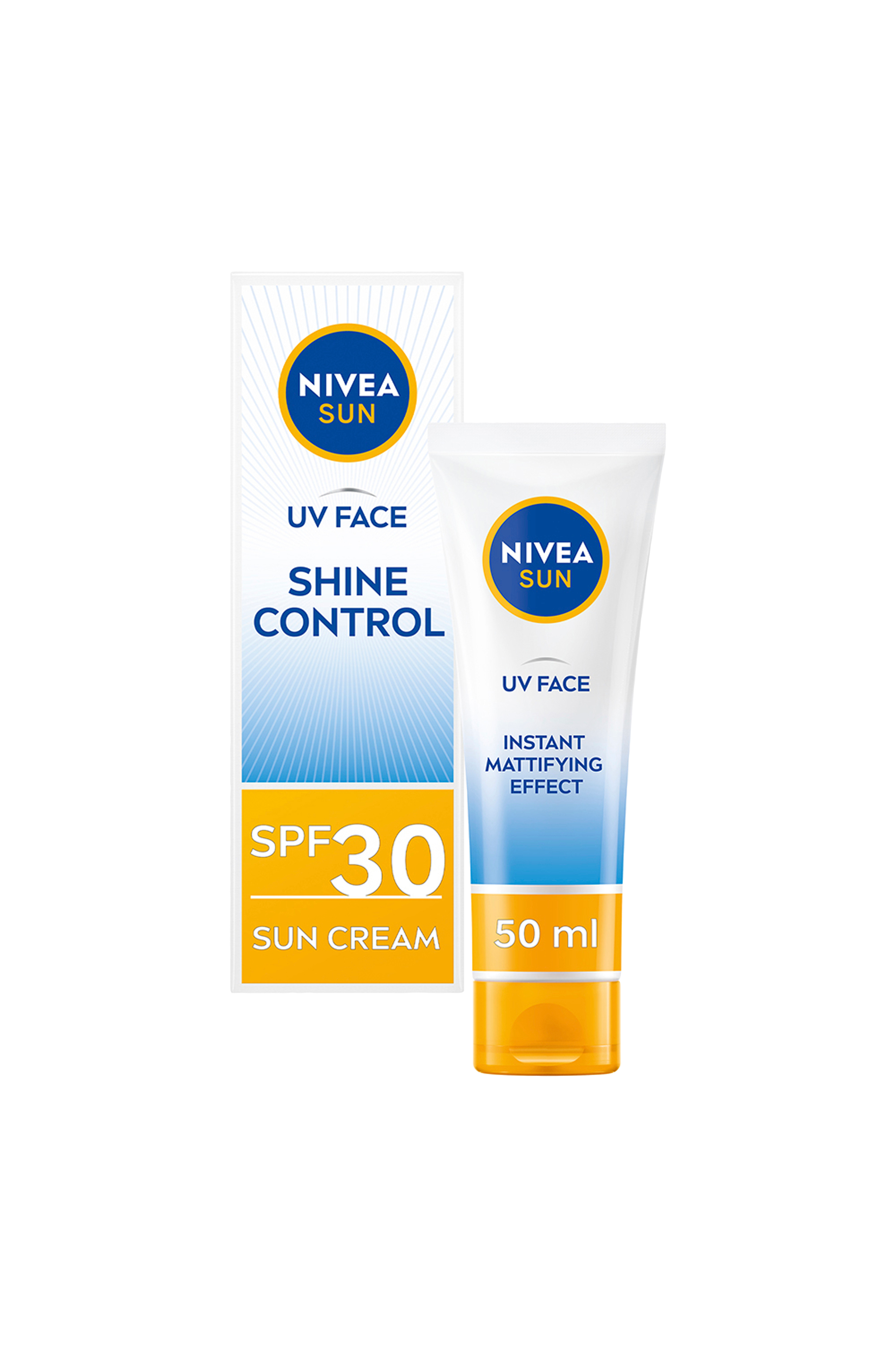 Nivea Face Shine Control SPF30. Högt Solskydd. Lätt, återfuktande solkräm speciellt utvecklad för den känsliga huden i ansiktet. Solkrämen har mattgörande effekt, absorberar överflödig olja från hudytan och lämnar huden lätt och inte kladdig. Högeffektiva UVA- och UVB-filter som ger ett omedelbart, långvarigt skydd och skyddar mot förtidigt åldrande. Innehåller naturliga antioxidanter som förebygger uppkomsten av förtidigt åldrande orsakat av solen samt minskar risken för solallergi.