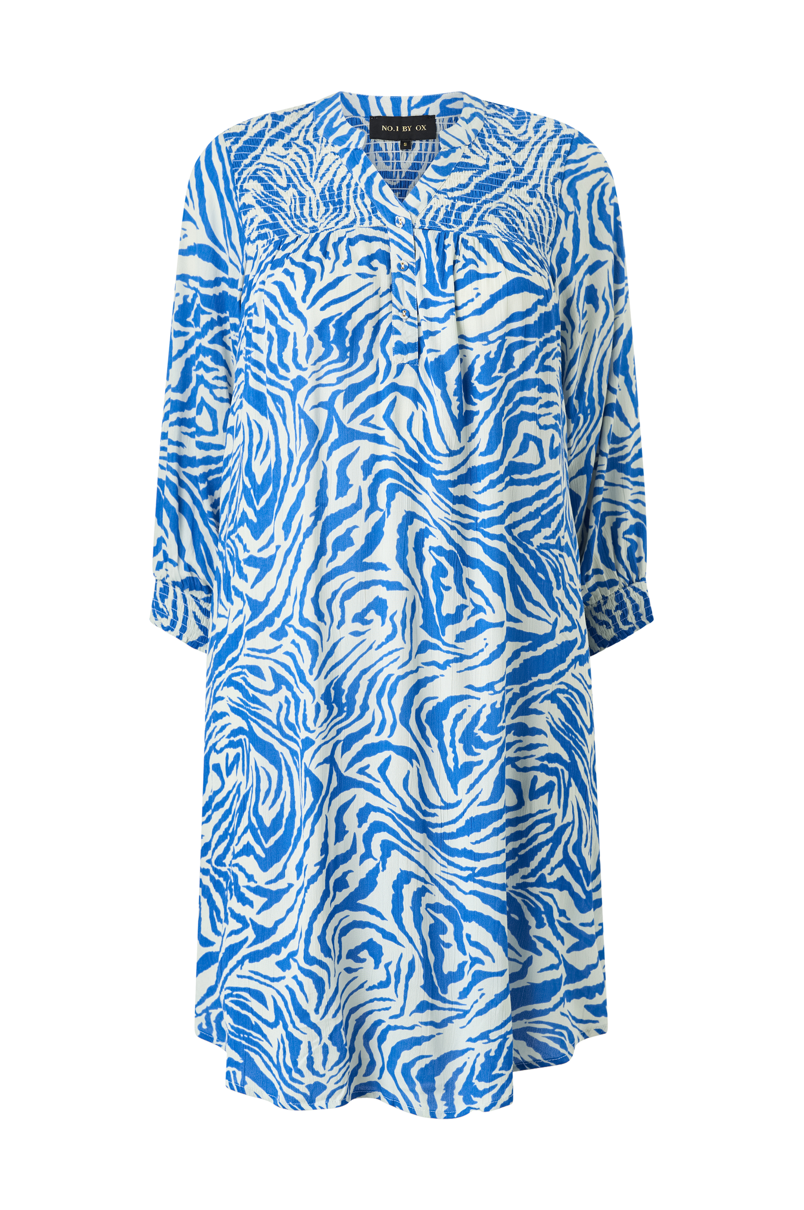 • Mönstrad klänning i viskos• V-ringning med klädda knappar• Smock upptill fram och bak• 3/4-långa ärmar med smock i ärmsluten• Rundad nederkant• Längd: 109 cm i storlek S• Plusstorlekar
