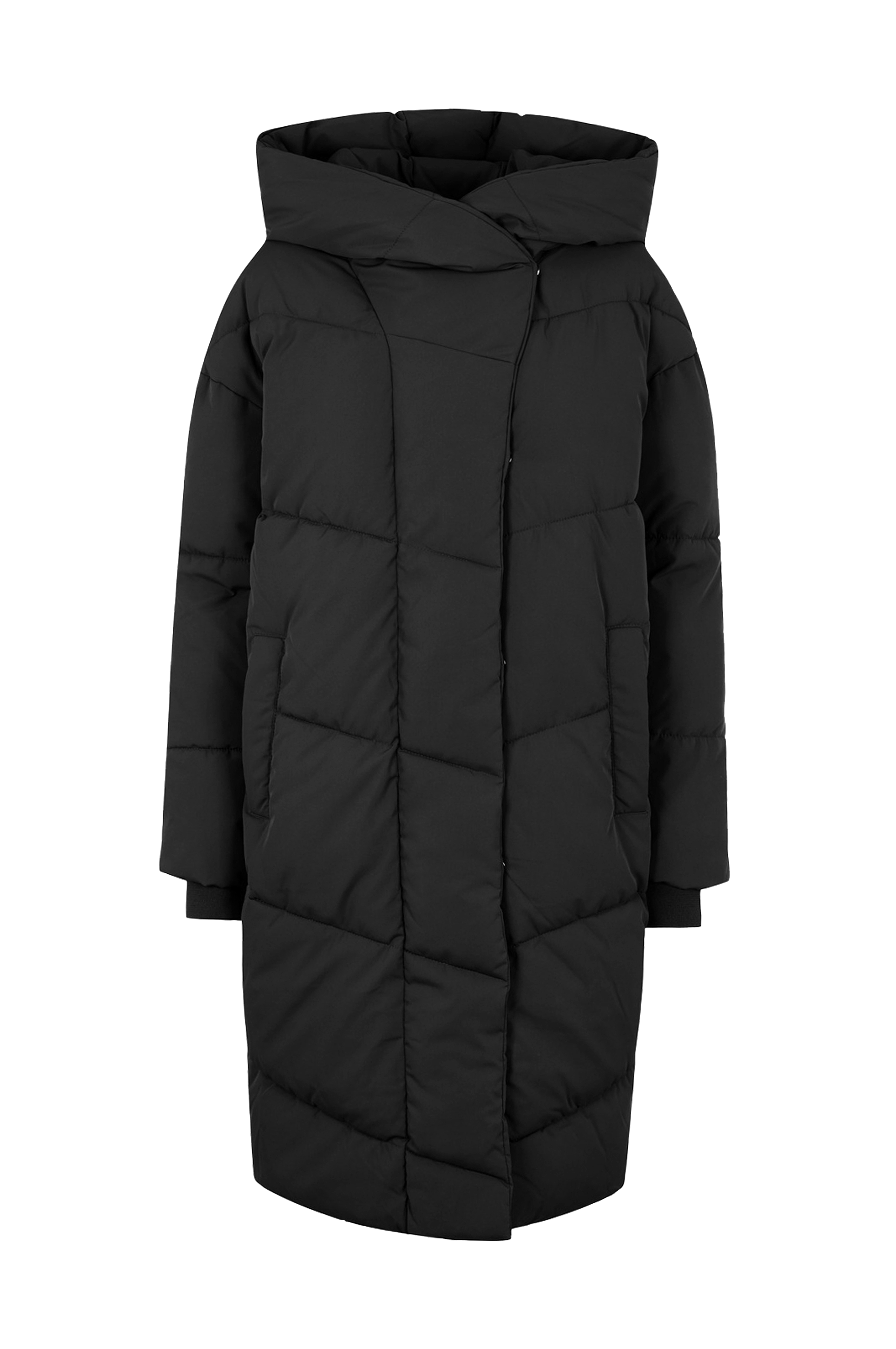 • Quiltad, vadderad kappa• Fast huva• Stängning med dolda tryckknappar• Två fickor• Ribbmuddar i ärmsluten• Plusstorlekar• Längd: 104 cm i storlek 44