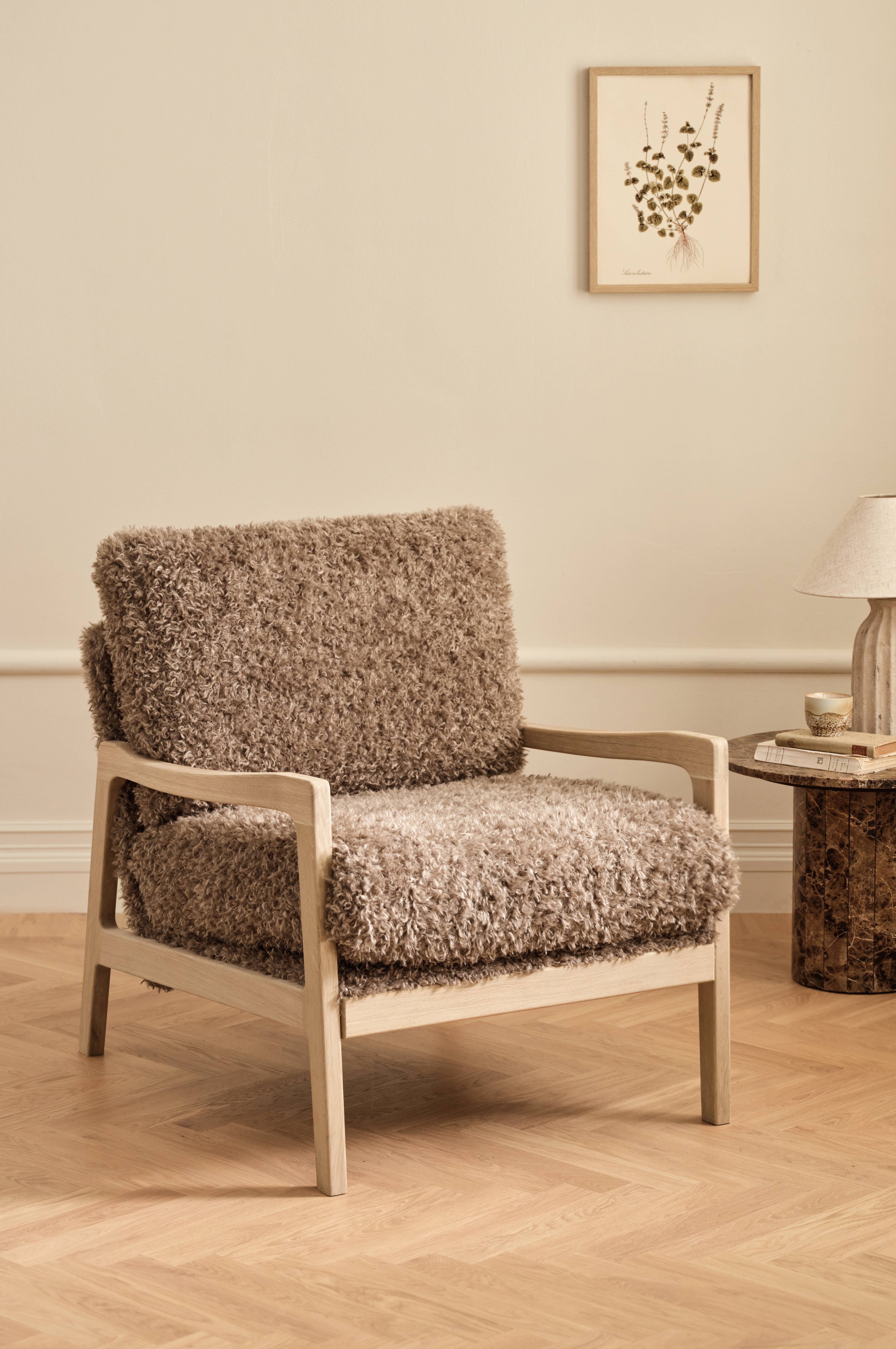 LAVAL är en fåtölj i skandinavisk stil med fokus på komfort och hållbarhet. Klädseln är ett mjukt teddytyg med en slitstyrka på 100 000 Martindale. Stommen är tillverkad av obehandlad ek, vilket ger ett naturligt och tidlöst utseende som passar i de flesta miljöer.