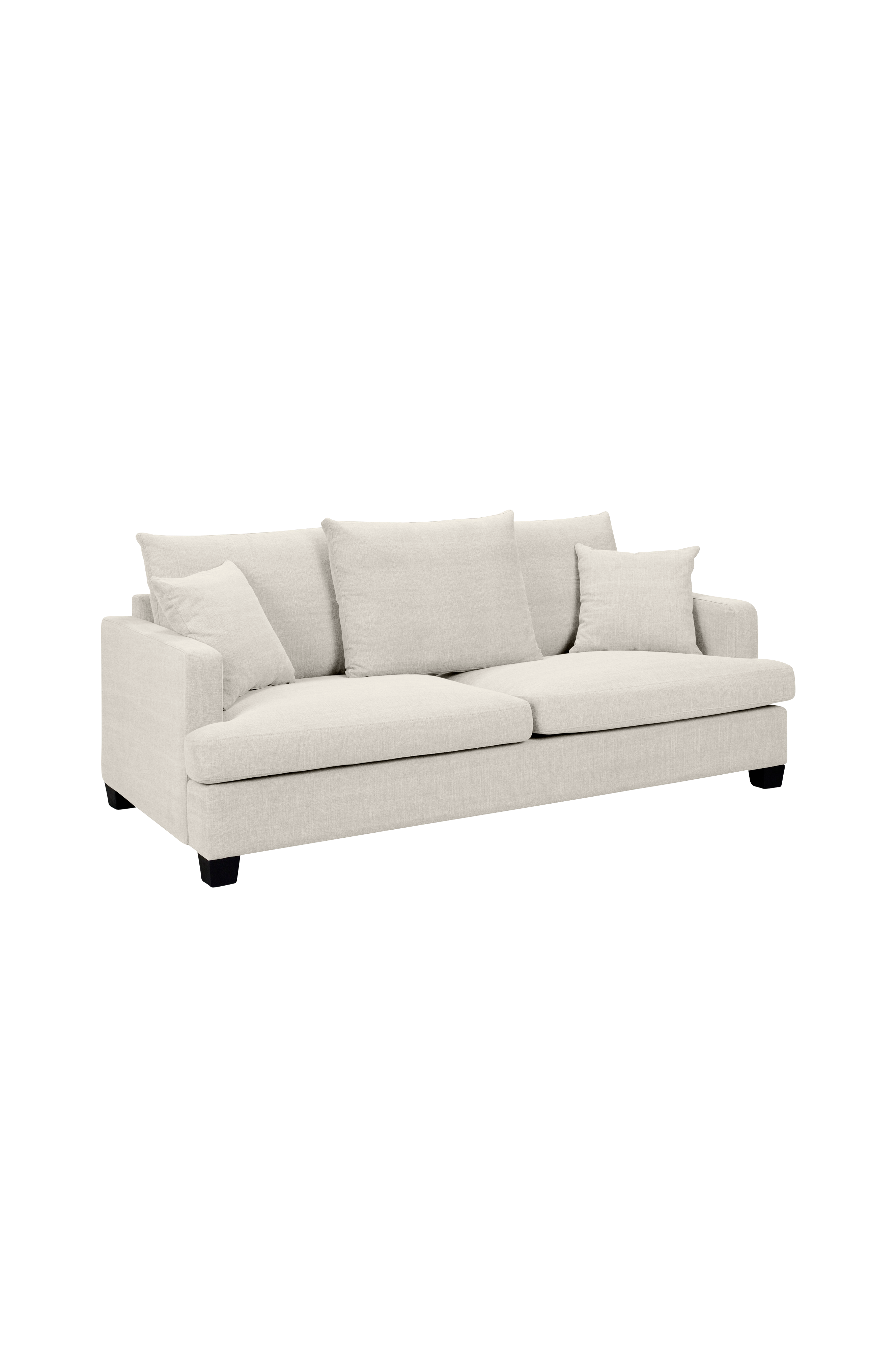 3-sits med hel stomme. Tyg av 60 % bomull och 40 % linne, Martindale 25 000. Handtvättas. Stoppning: Sits; kallskum med duntopp. Rygg; kanalsydda ryggkuddar av silikon / dun. Svarta träben. Mått; Bredd 216, Djup 96, höjd 92 cm. Sitthöjd 47, sittdjup 77 cm.