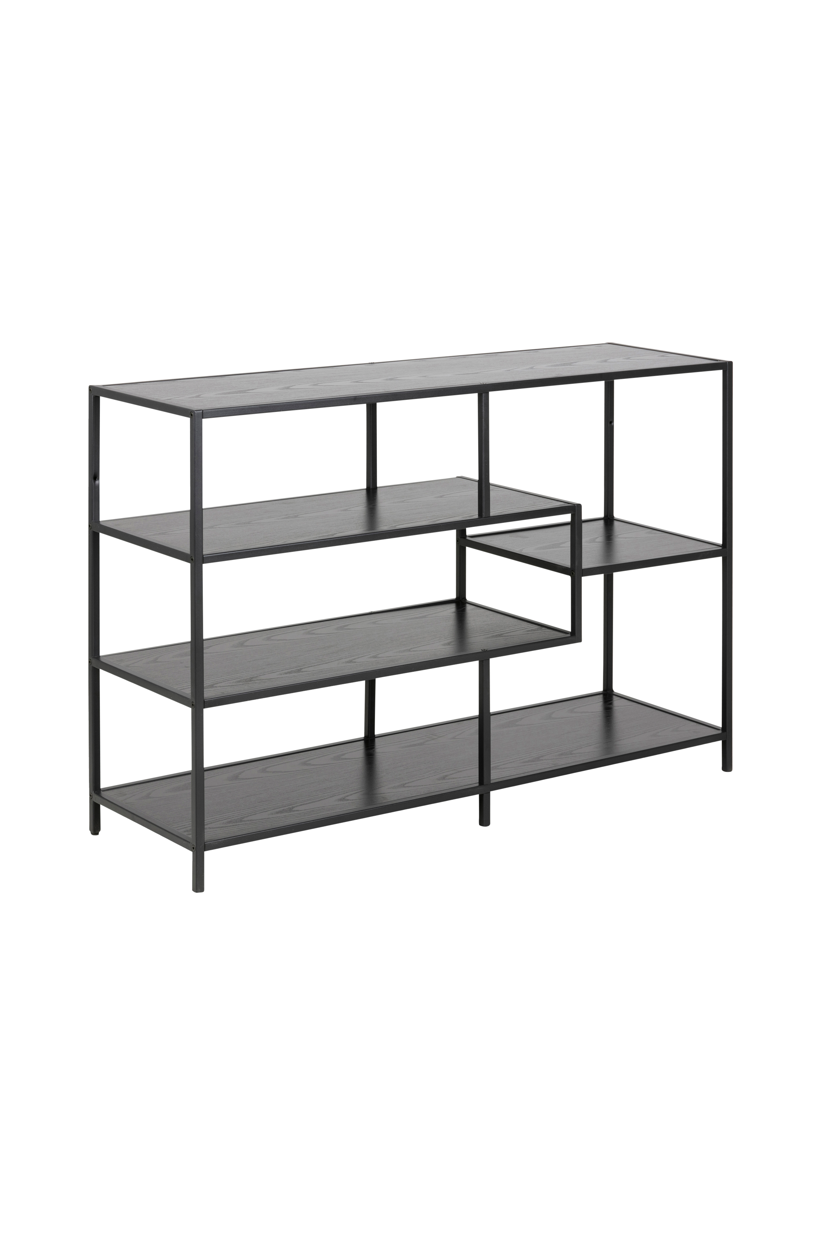 Bokhylla med flera hyllplan i melamine som har en metallbas med en pulverlackerad mattsvart finish. Denna hylla passar in i de flesta hem som man också kan kompletta med andra möbler som skrivbord, konsoler, väggaggregat och bord. Exklusiva designrättigheter