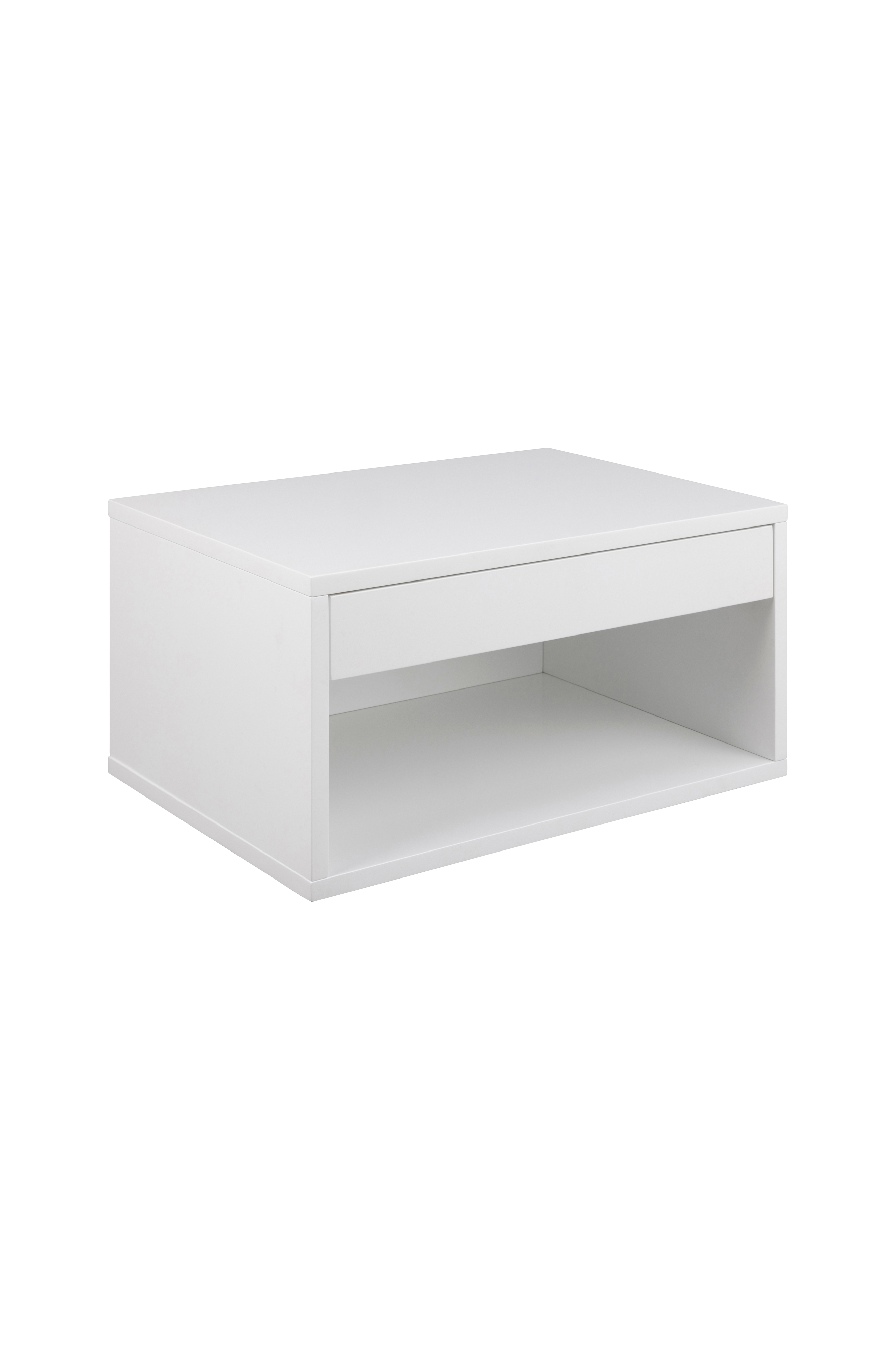 Ett praktiskt men ändå attraktivt vitt nattduksbord som passar perfekt in i ett modernt sovrum. Den smidigt glidande lådan är perfekt för dina sängtillbehör. Det öppna facket undertill är perfekt för böcker eller tidningar.