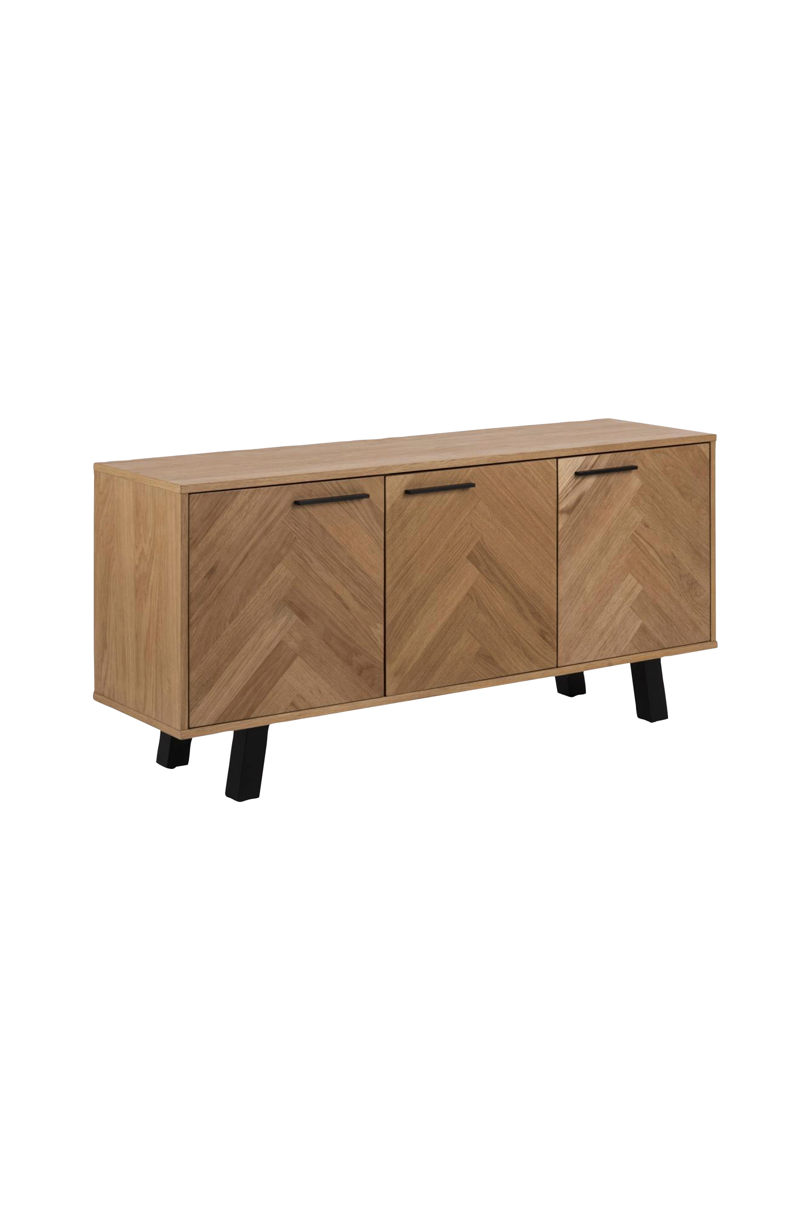 Ge ditt vardagsrum en sofistikerad uppgradering - inget är mer stilfullt än fiskbensmönster. De svartmålade benen framhäver den vackra effekten. De passar perfekt med den oljade bordsskivan av ekfaner och ger en komplett stil. Vad gäller förvaring finns det gott om utrymme att dölja oredan och ovanpå kan du ställa dina favoritföremål.