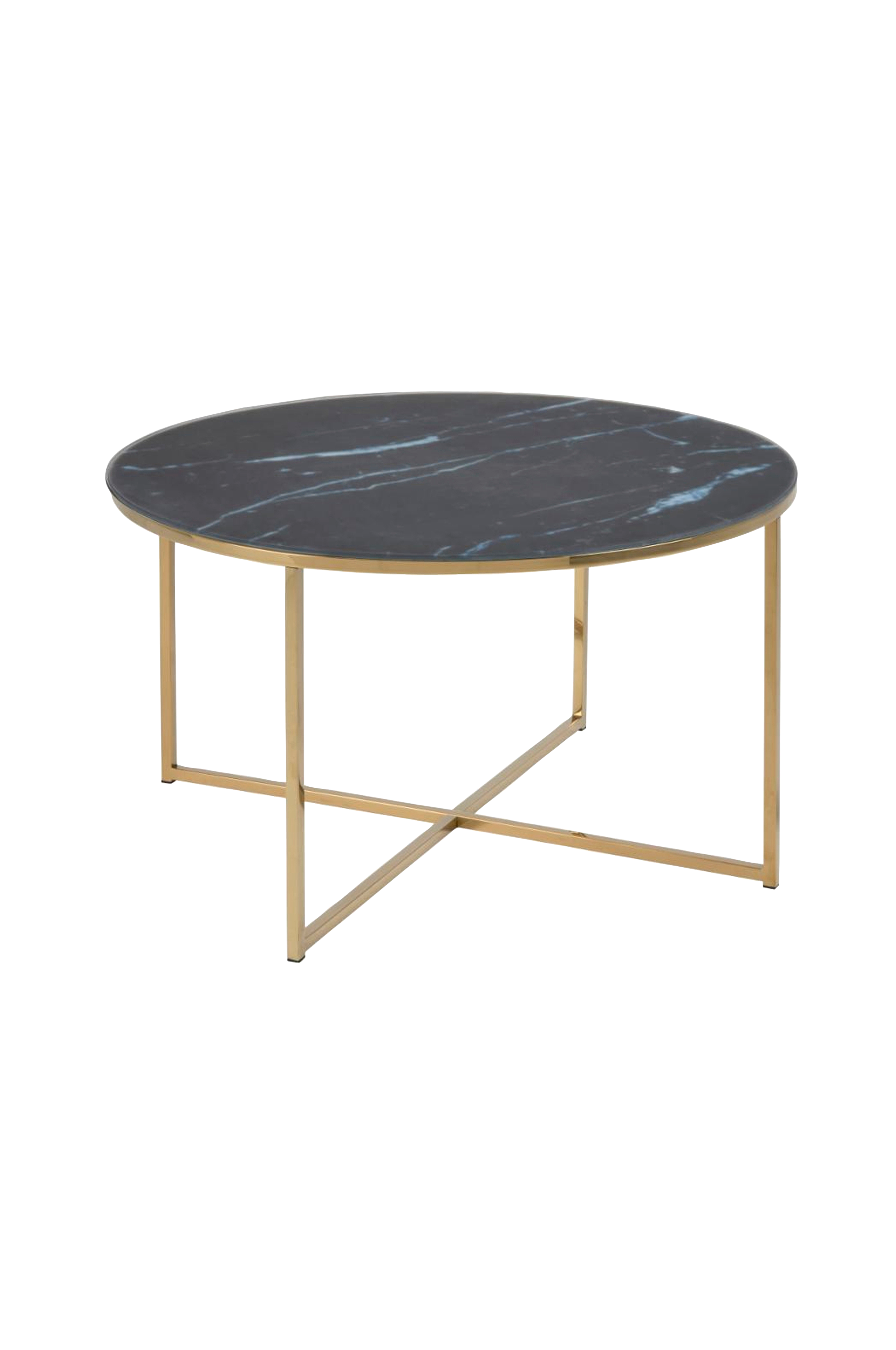 Vi presenterar ett soffbord som är både modernt och kraftfullt. Soffbordets runda form ger generöst utrymme för brickor, tidningar och kaffe. Den korsade metallstommen fortsätter som en stödjande ram runt bordsskivan som ser ut som marmor. De noggrant utvalda materialen är lättskötta.