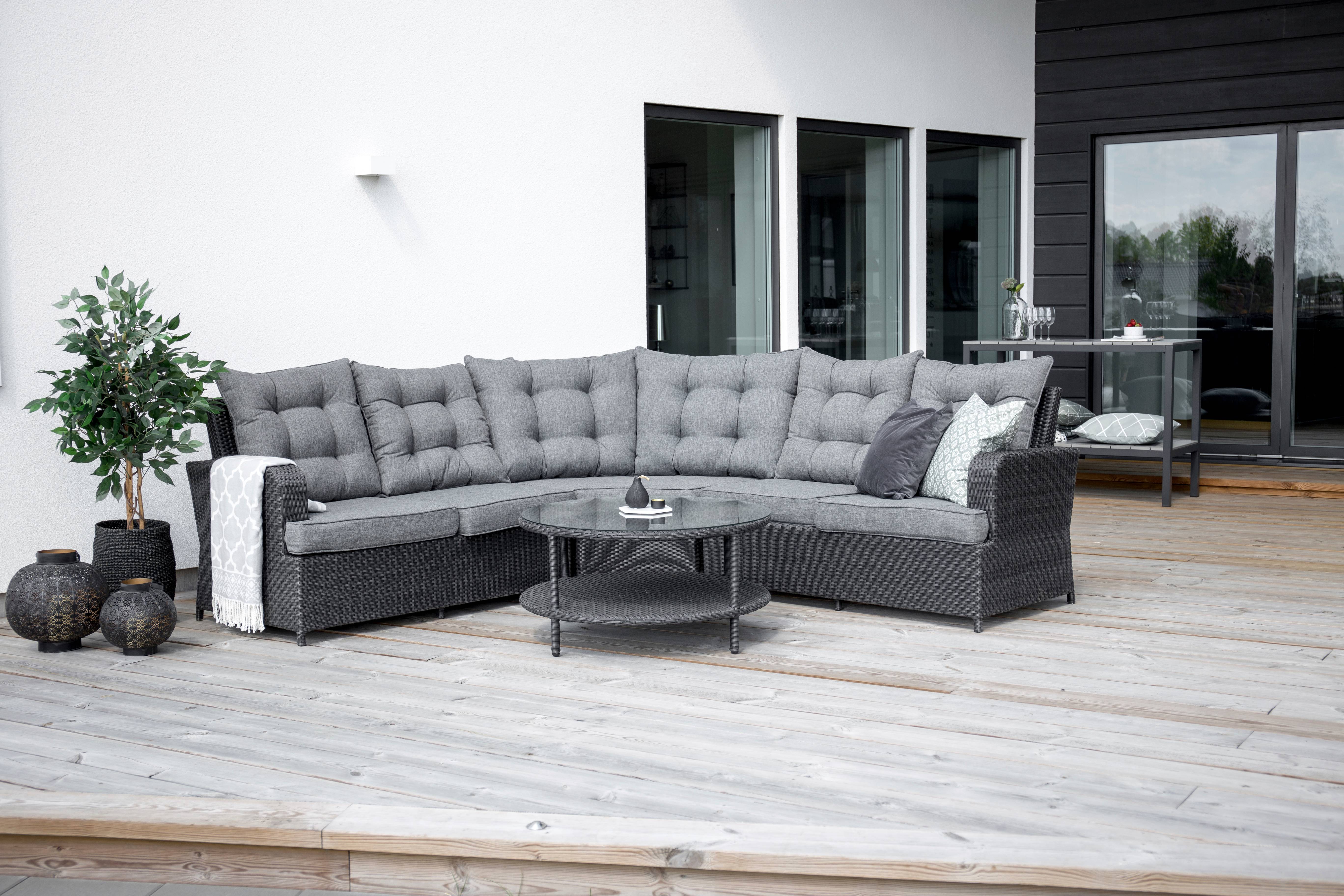 Skön hörnsoffa inkl. bord i konstrotting och med slitstarka, dynor. Mått: Soffa 245 x 245, höjd 84 cm. Bord Diameter 80, höjd 45 cm.