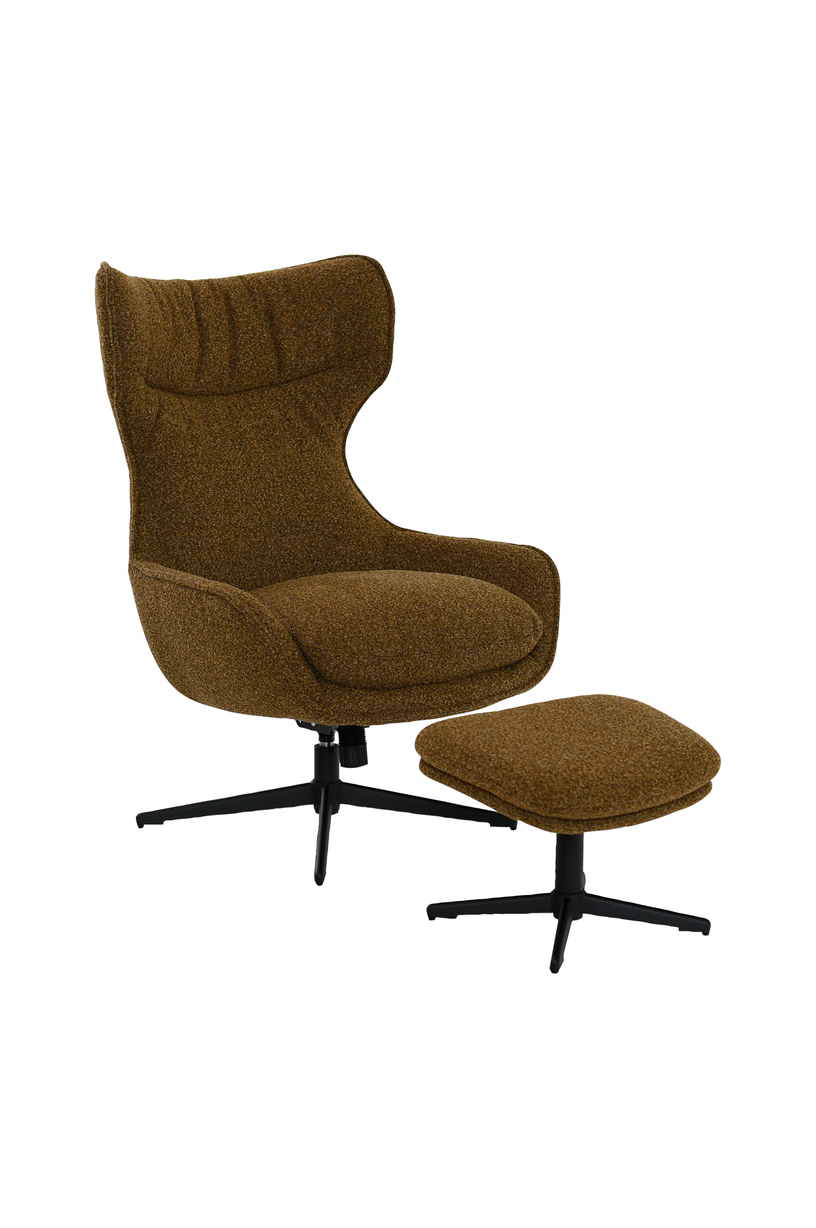 En modern snurrfåtölj med tillhörande ottoman. Stolen har ett högt ryggstöd med justerbar lutningsfunktion, vilket ger ergonomiskt stöd och komfort. Både stolen och ottomanen är klädda i ett strukturerat brunt tyg som ger ett varmt och elegant utseende. Basen är tillverkad av robust svart metall med en fyrstjärnig design som garanterar stabilitet och ett elegant modernt utseende. ottomanen kompletterar stolen perfekt och ger extra benstöd.artikeln kräver montering