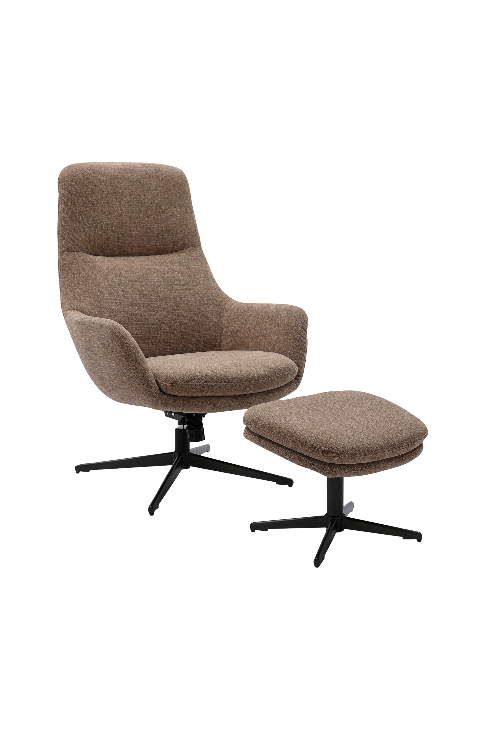 En modern fåtölj med en matchande ottoman, med en elegant och minimalistisk design. Stolen har ett högt ryggstöd med justerbar lutningsfunktion för ökad komfort. Både stolen och ottomanen är klädda i ett mjukt, strukturerat tyg i en neutral ton. Underredet är tillverkat av robust svart metall med en fyrstjärnig design som ger stabilitet och ett modernt utseende. Stolen har också en snurrfunktion som gör det enkelt att rotera.artikeln kräver montering