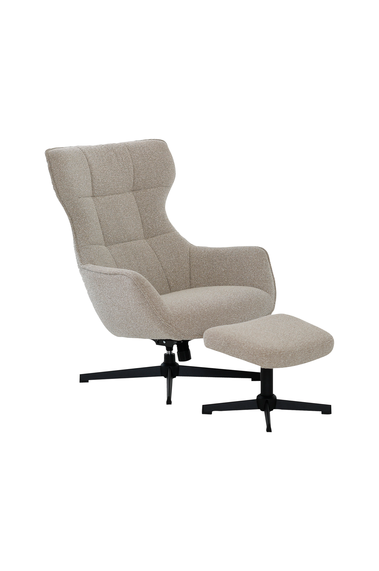 En modern snurrfåtölj med en matchande ottoman. Stolen har ett högt ryggstöd med en mjukt bevingad design och en stoppad sits och rygg för komfort.