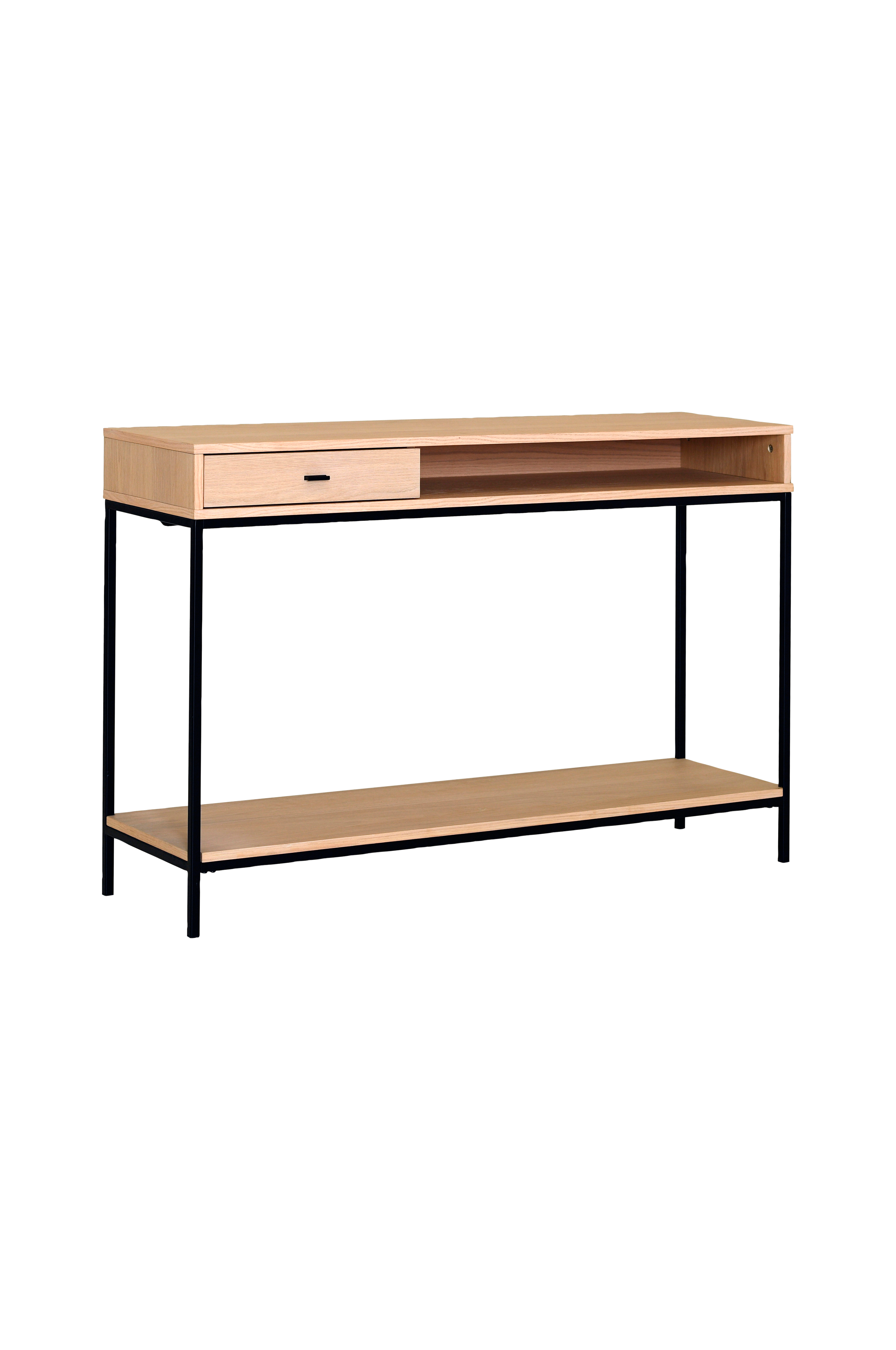 Modernt konsolbord i lackad ek och metall.Bordet har en praktisk låda och en hylla.Föremålet kräver montering.