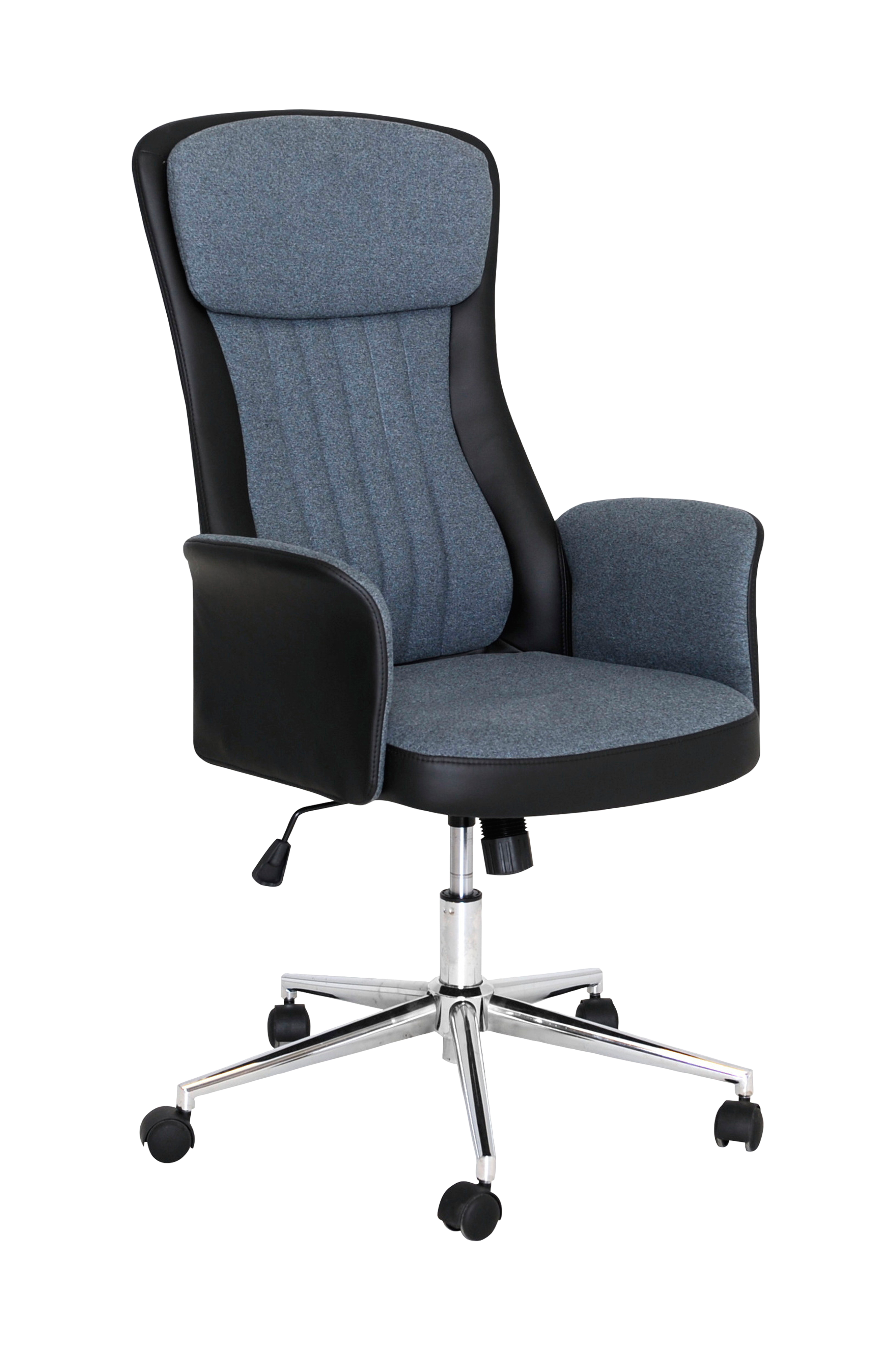 Klassisk kontorsstol i tyg och syntetiskt läder. flexibel sitthöjd mellan 46 och 56 cm. Sitsen kan användas i låst eller fritt svävande läge. När stolen används i fritt läge är det möjligt att justera det tryck som krävs för att röra sig fram och tillbaka. Artikeln kräver montering.