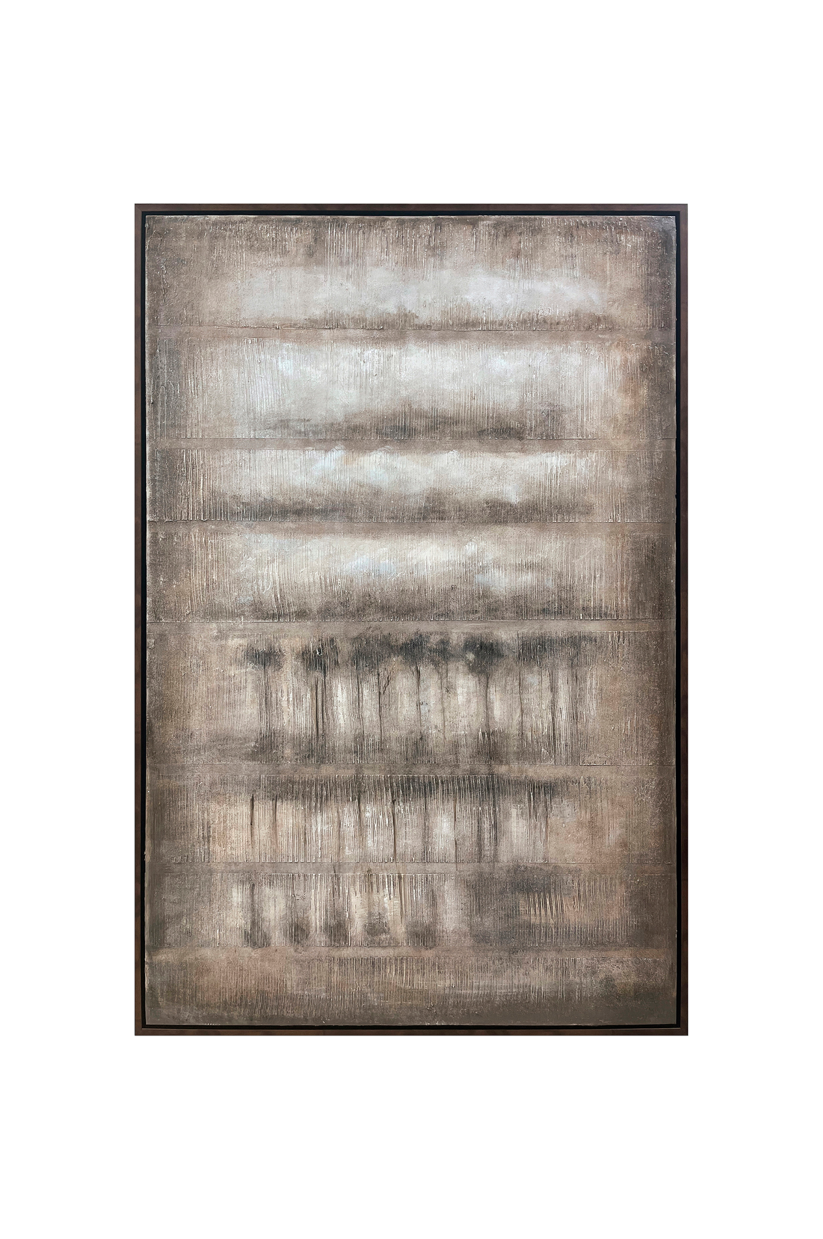 Detta konstverk är en stor, vertikalt orienterad duk inramad med en smal, mörk kant som ger den ett raffinerat och modernt utseende. Målningen har en abstrakt komposition som domineras av jordnära toner som skapar en lugn, organisk atmosfär.