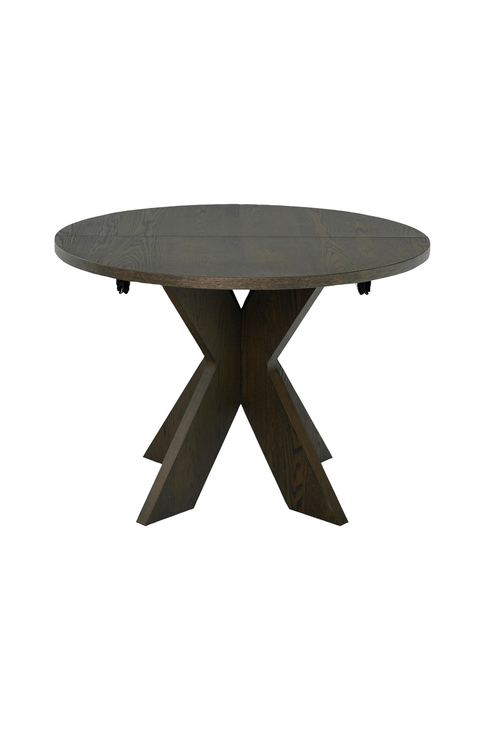 Detta är ett elegant matbord tillverkat av mdf med en finish av lackerad ekfanér. Bordet har en rund skiva med en elegant, modern design och ett distinkt korsat benunderrede som ger en modern touch. Det levereras med två iläggsskivor, så att du enkelt kan utöka bordet med ytterligare sittplatser när det behövs. Den mörka träfärgen och det eleganta hantverket gör det till en perfekt mittpunkt för alla matplatser. Artikeln kräver montering.