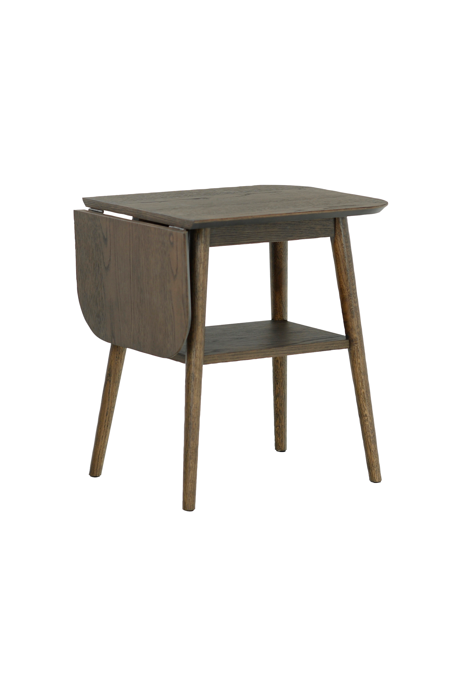 Ett sidobord i lackad ekfanér med en nedre hylla och en utdragbar klaff som kan fällas upp för extra avställningsyta. Bordet står på fyra avsmalnande ben, vilket ger det en elegant och minimalistisk design.Artikeln kräver montering.