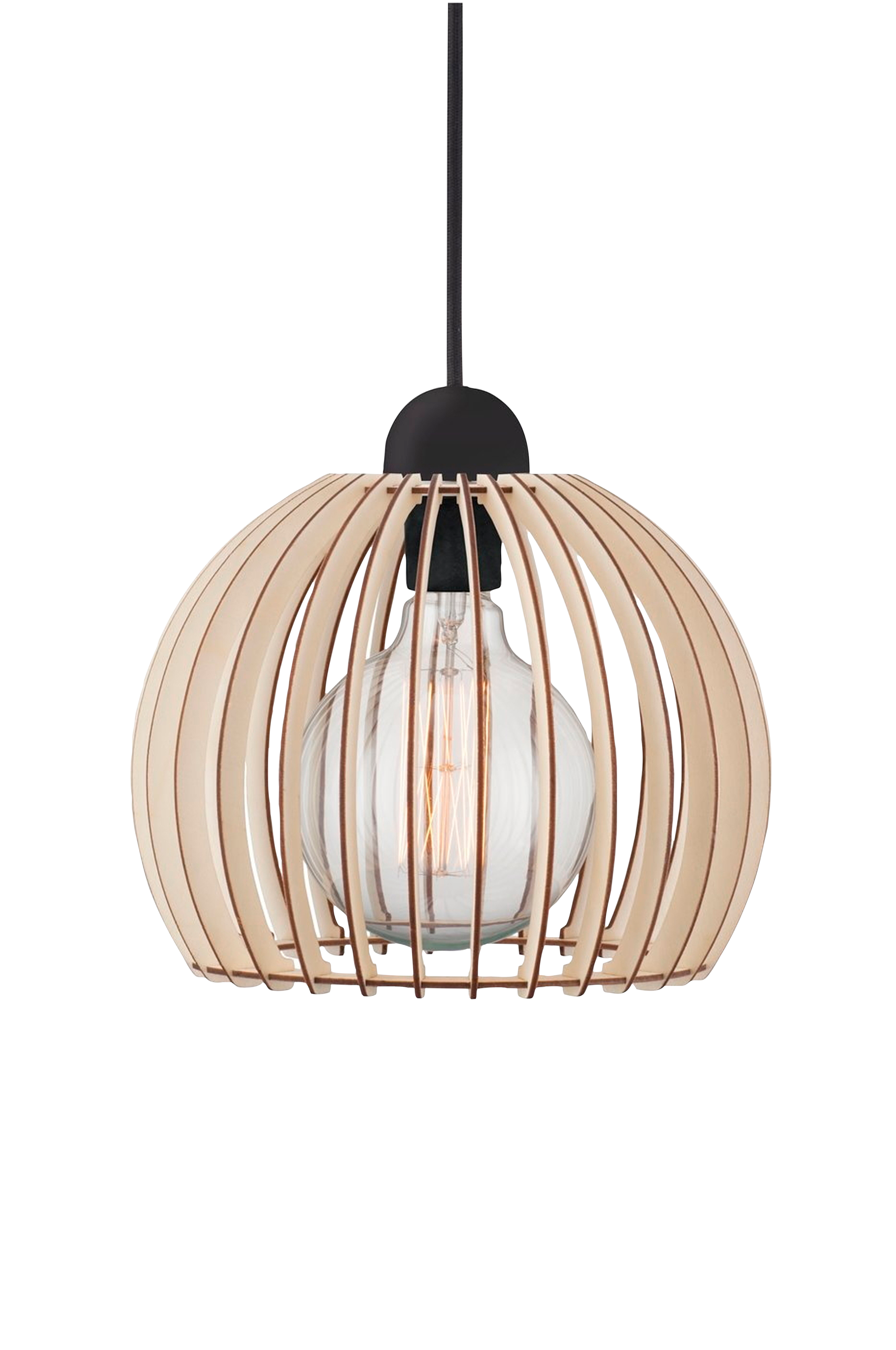 Taklampa i grafisk design med skärm av trälameller som ger en behaglig ljusspridning. Eftersom ljuskällan är synlig mellan lamellerna, rekommenderar vi att lampan kompletteras med en dekorativ glödlampa. Lampan är bland annat perfekt över köksbänken eller matbordet och levereras utan ljuskälla.