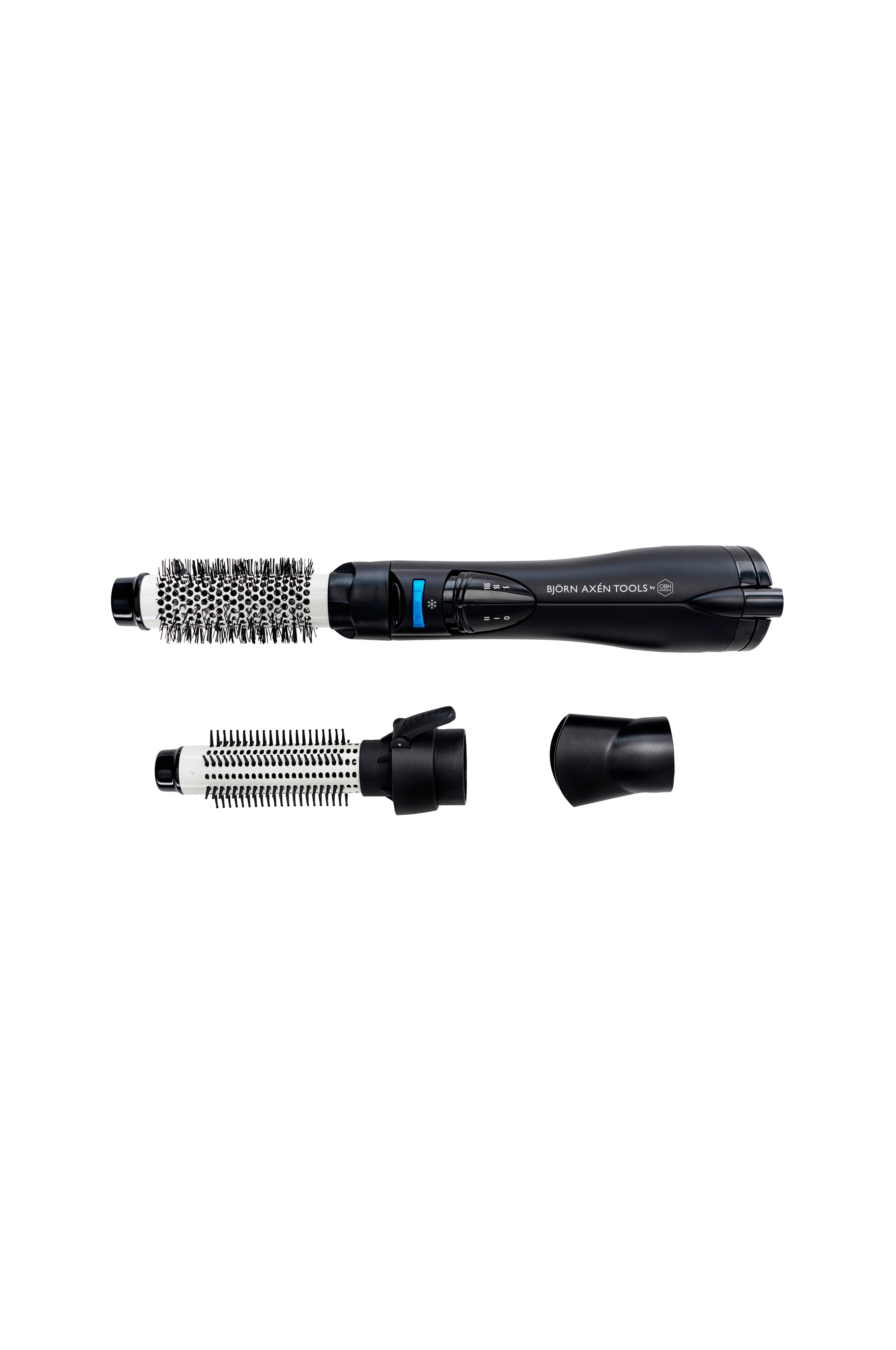 Medföljande tillbehör – ett concentrator-munstycke som torkar fuktigt hår, ett borsthuvud som är 30 mm i diameter med infällbara piggar som reder ut, formar och ger volym till ditt hår. Det följer även med ett rundborsthuvud som är 32 mm i diameter med keramisk beläggning som formar och ger dig lockar med volym.