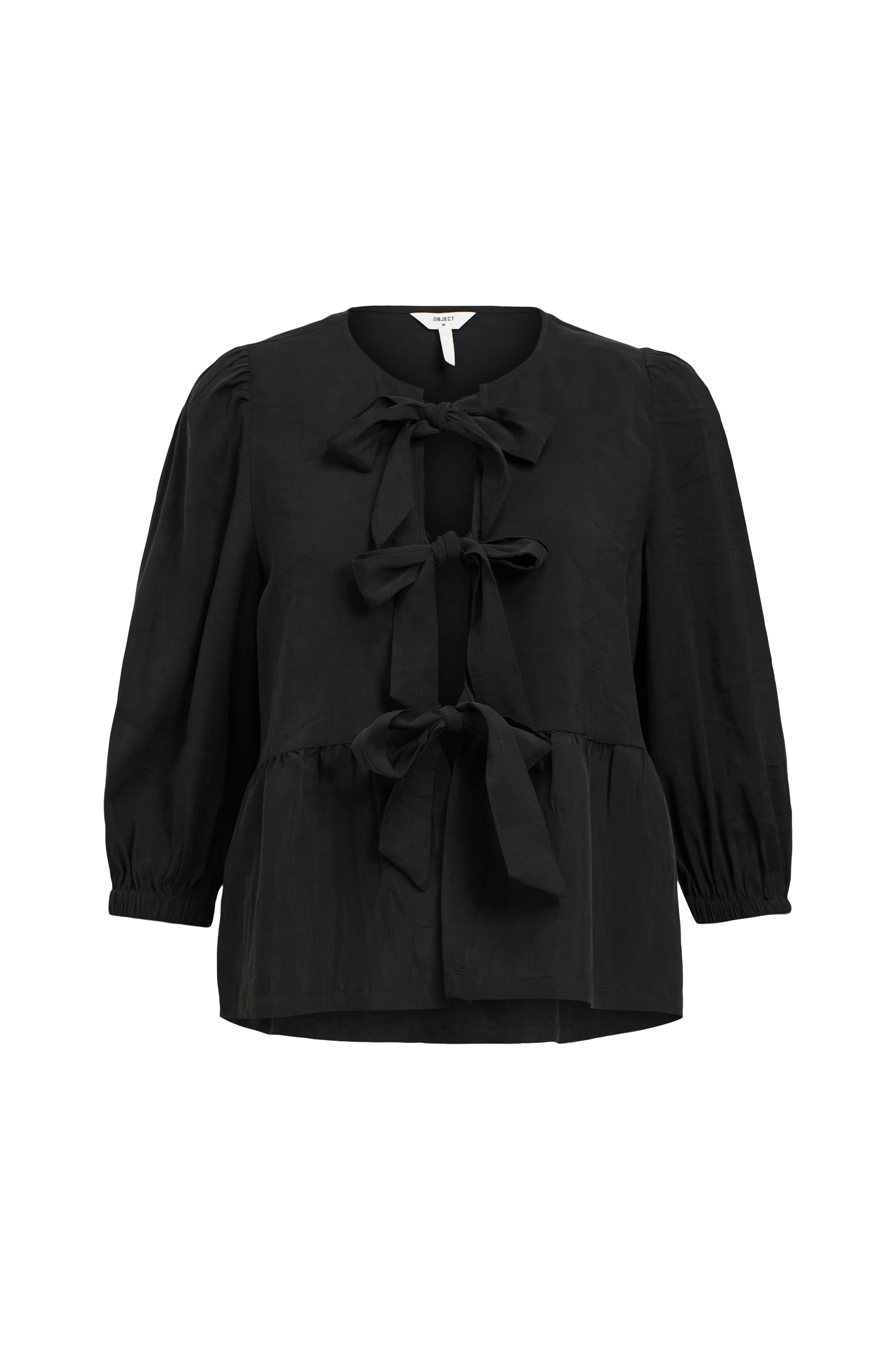 • Peplumdesign med rynk i midjan• Rund hals• Tre breda knytband längs framkanten• 3/4-lång puffärm med resår i ärmsluten