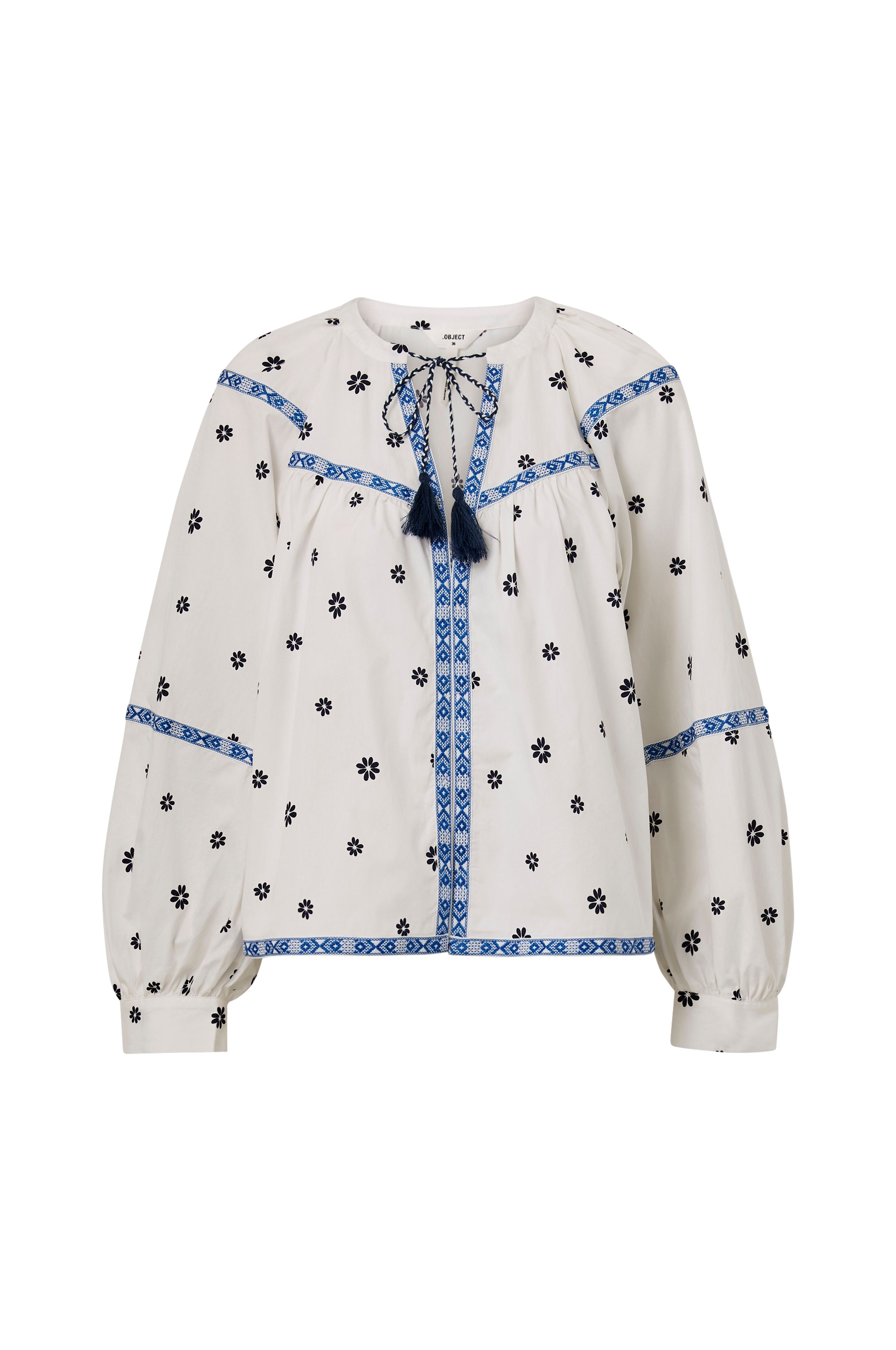 • V-ringad hals• Knytband i halsen med tofsar• Dold hysk- och hakestängning• Vida, långa ärmar• Manschett med två knappar• Påsydda, broderade band
