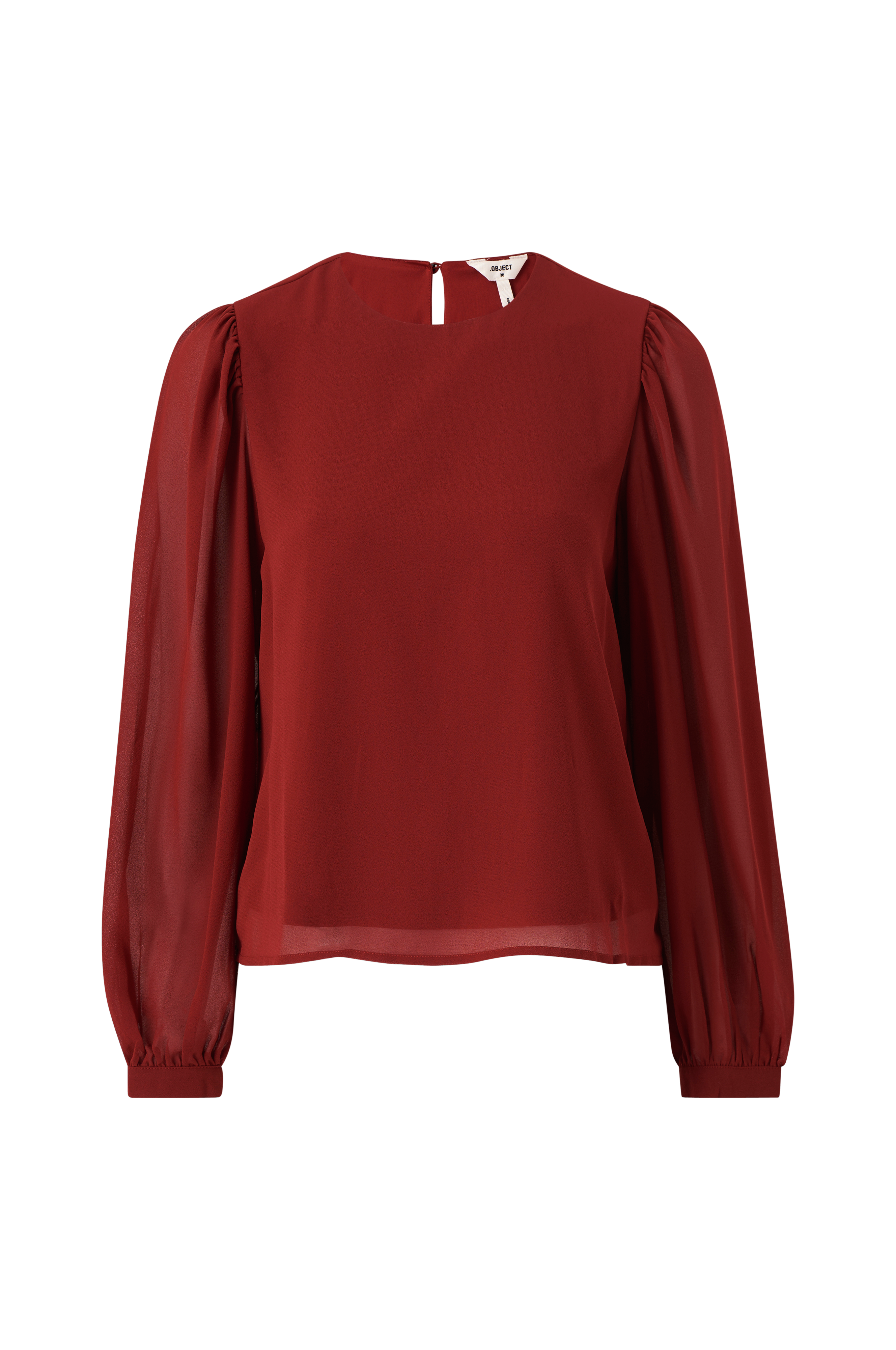Långärmad blus i två lager. Det övre lagret är i transparent mesh och det undre i stretchtrikå. Transparenta puffärmar med rynk vid axlarna och ärmsluten. Rund halsringning med sprund och knapp i nacken. Smal manschett med en knapp.