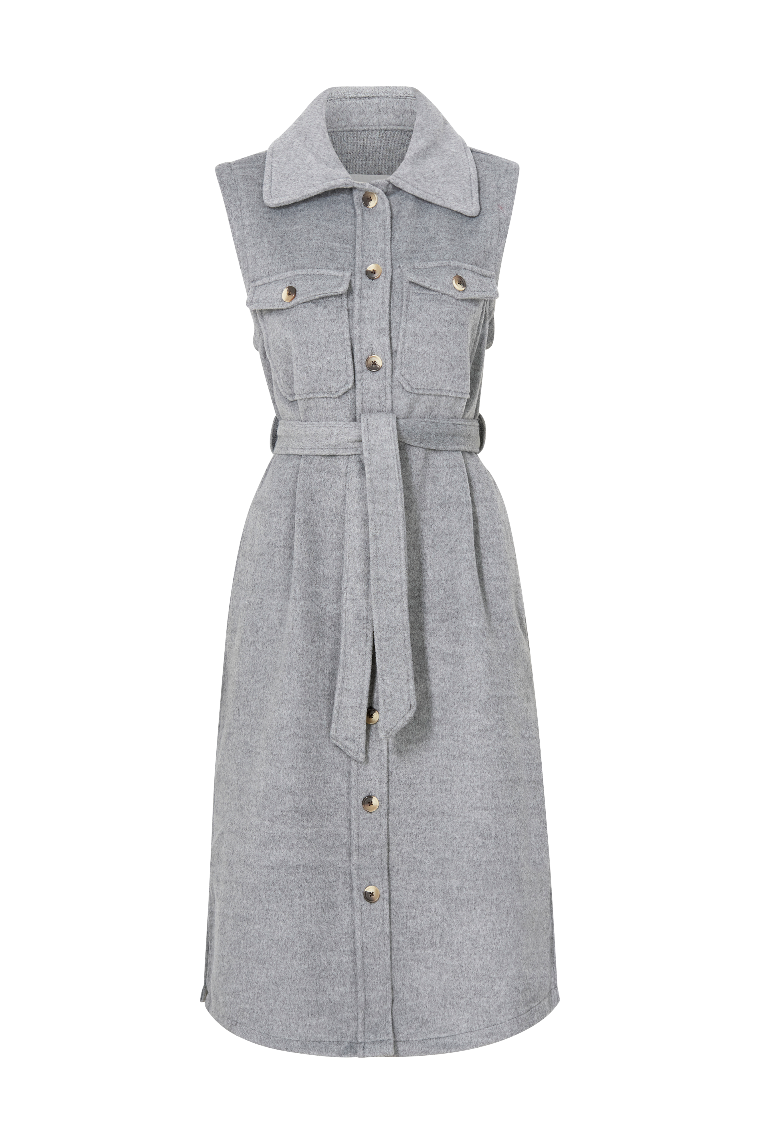 Lång, ärmlös kappa i mjuk, filtad kvalitet. Rak modell med knappar fram, två bröstfickor och fickor i sidorna. Knytskärp i midjan och korta slitsar i sidorna nedtill. Längd ca 118 cm i stl 36.