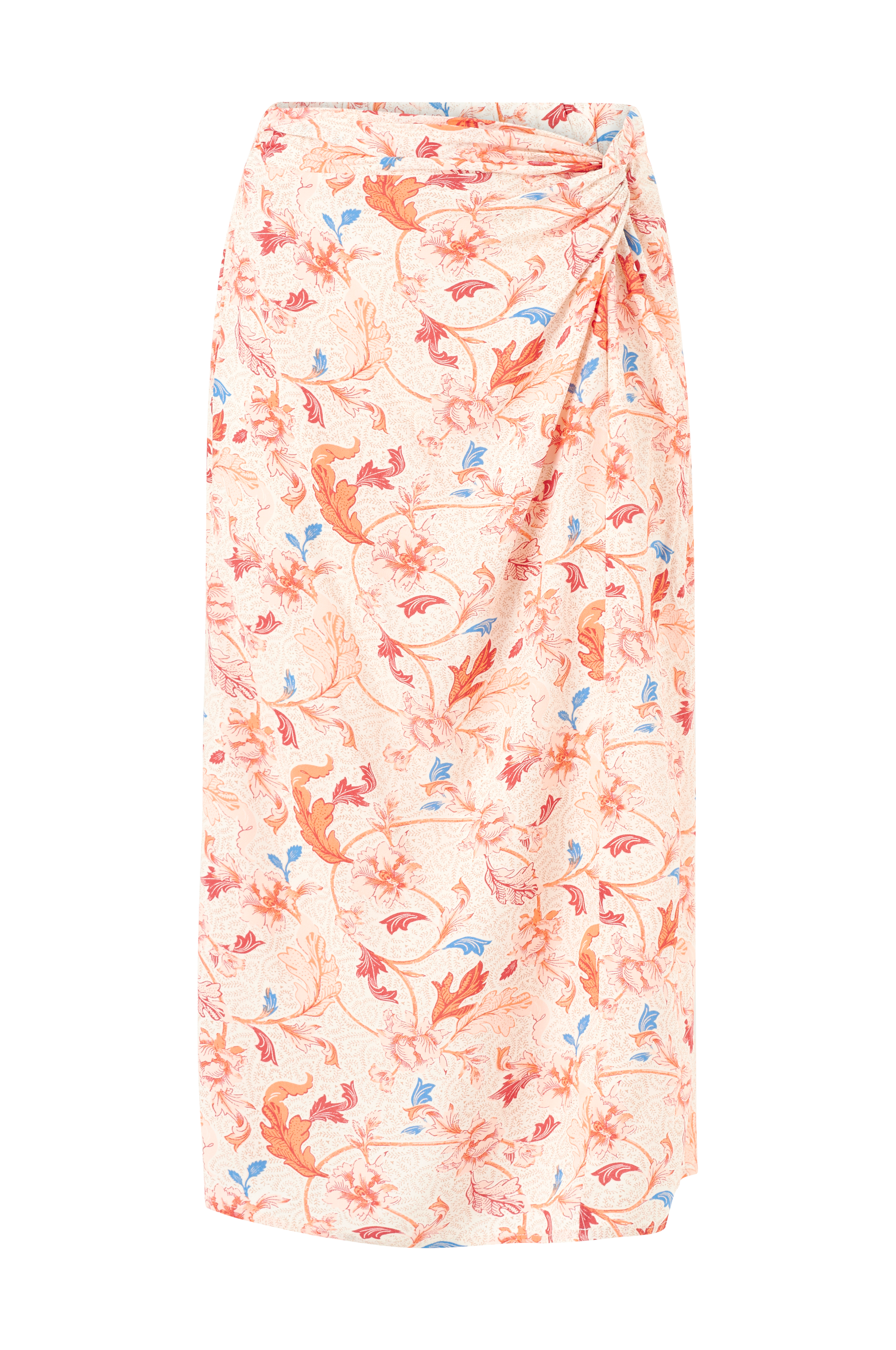 Kjol i lätt utsväng modell med drapering upptill i ena sida. Linning bak med infälld resår och dold dragkedja i sidan. Längd ca 78 cm i stl 36.