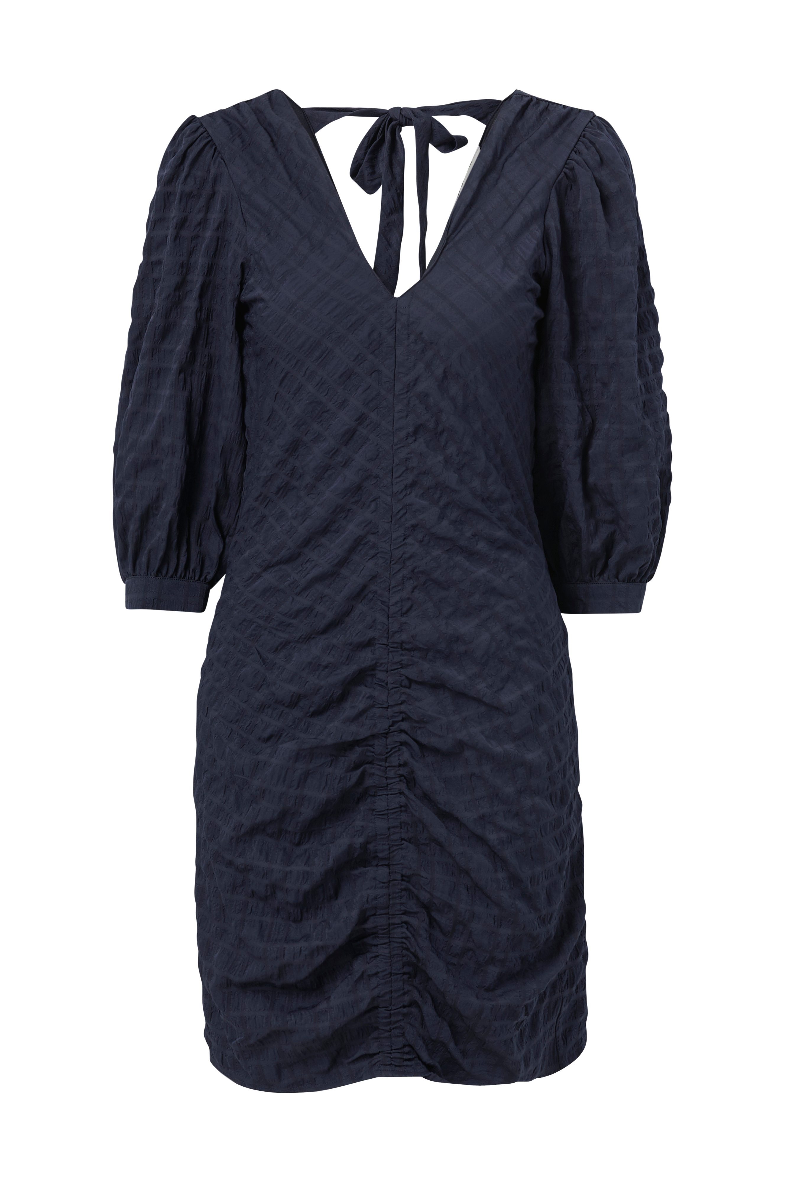 Figurformad klänning i vävd bäckeböljakvalitet som har elastisk drapering hela vägen fram. V-ringning i hals och rygg med långt knyt i nacken Vid, 3/4-lång ärm med rynk vid axeln och påsydd kant i ärmslut. Längd ca 92 cm i stl 36.