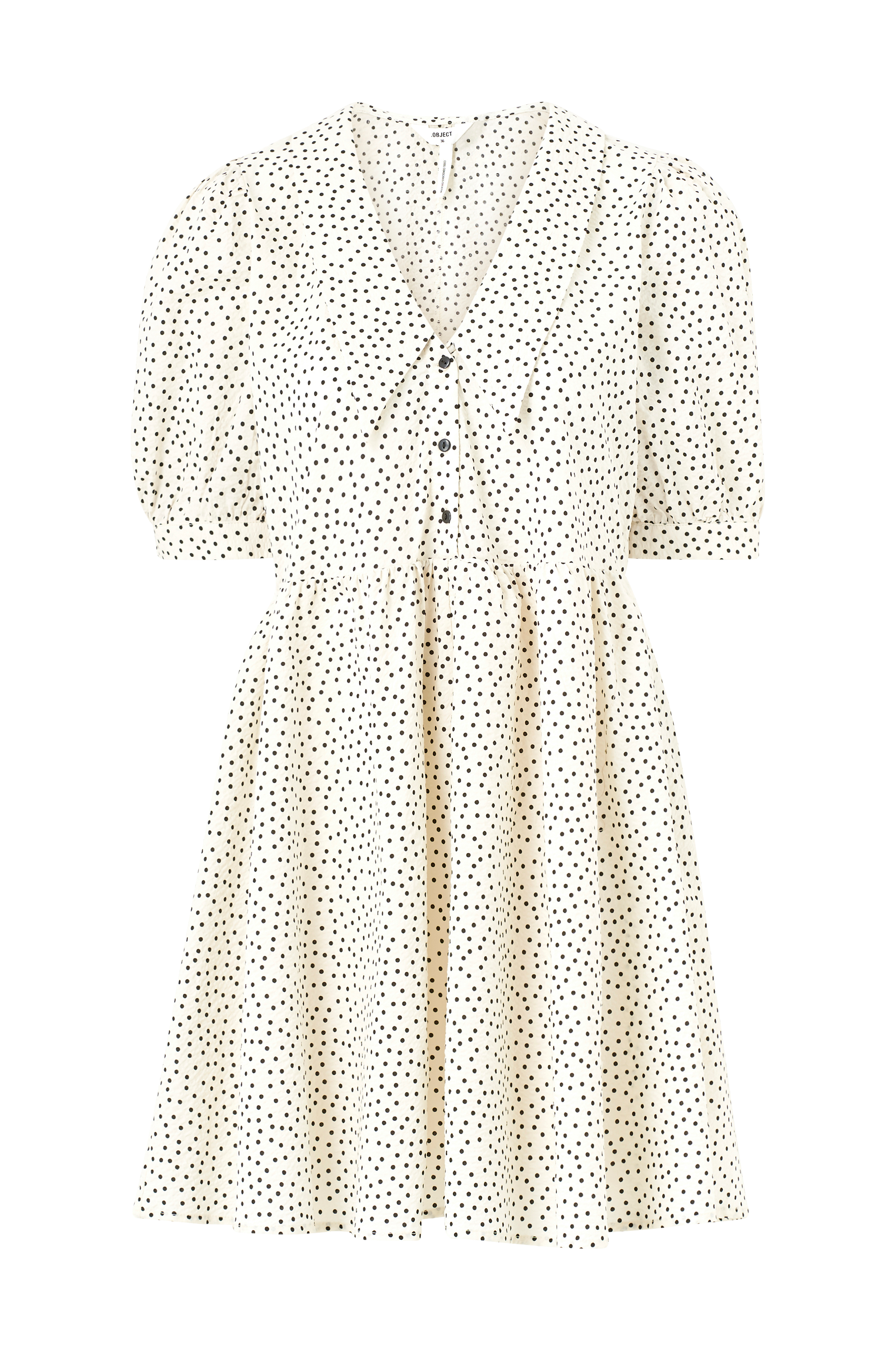 Klänning i lätt figurformad oversizemodell av vävd bäckeböljakvalitet. V-ringad hals med krage som har långa snibbar och kort knappslå ner till midjan. Halvlång, vid ärm med rynk vid axeln och påsydd kant i ärmslut. Avskärning med rynk i midjan och vidd i kjolen. Längd ca 90 cm i stl 36.