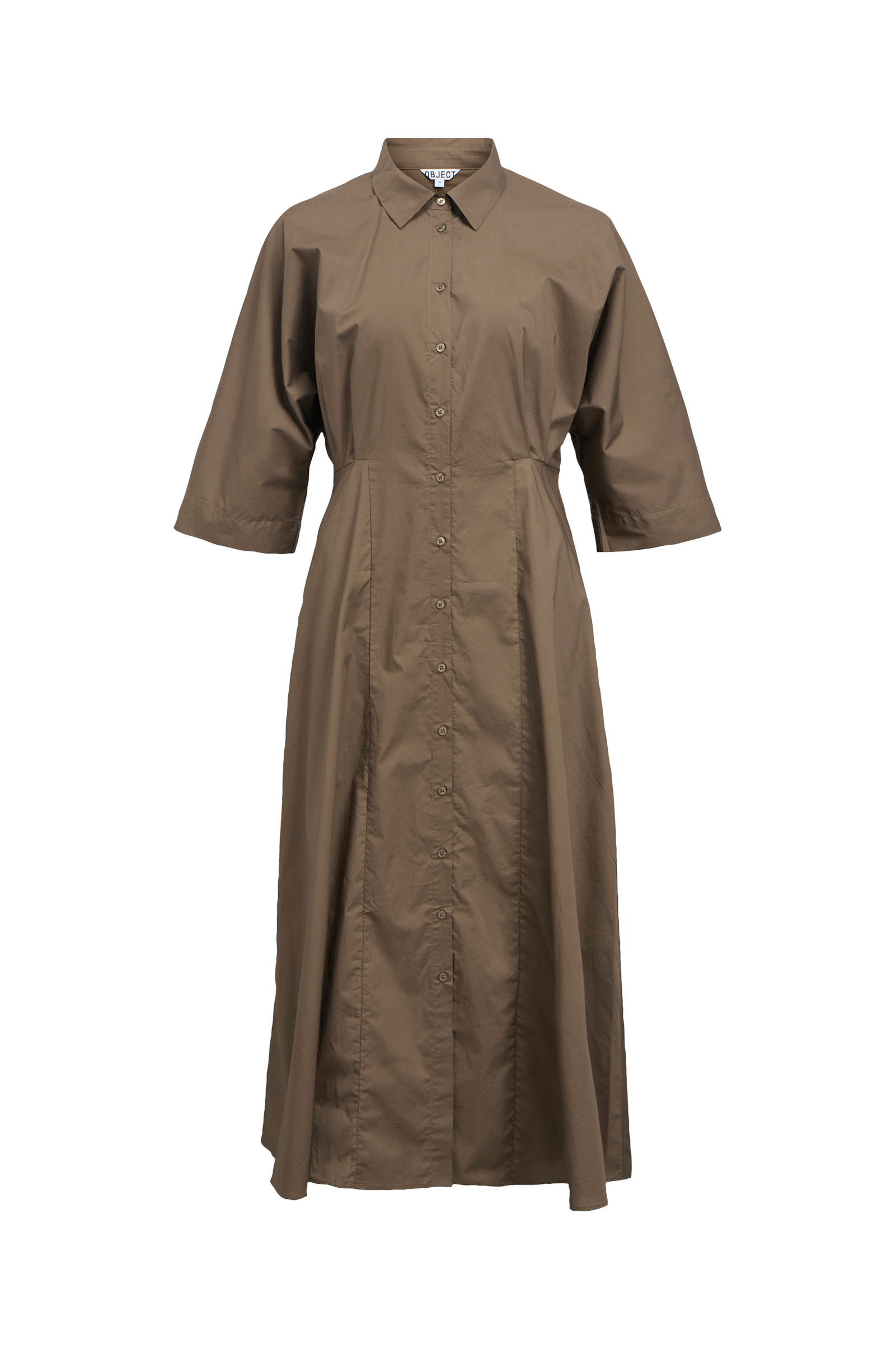 • Lång skjortklänning i bomull• Halvlånga ärmar• Knappar hela vägen fram• Veck i midjan• Sidfickor• Utställd kjol• Längd: 130 cm i storlek 36