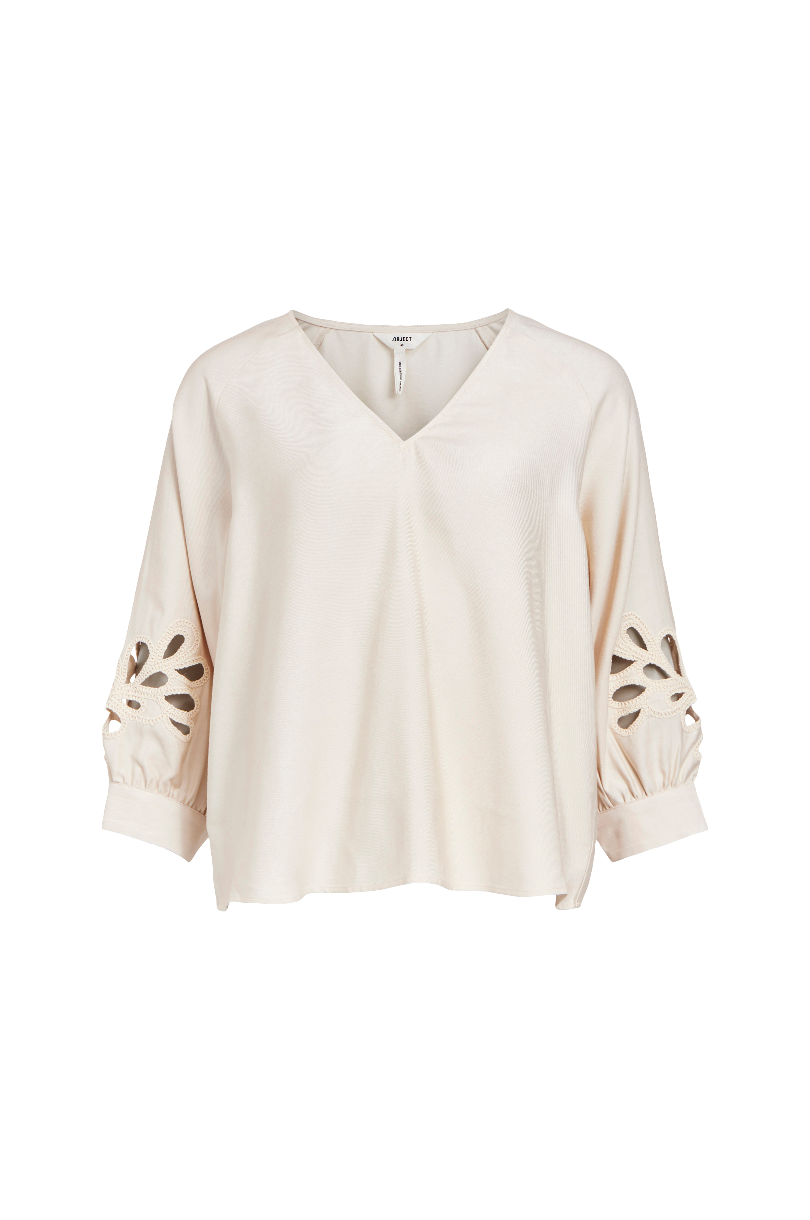 • Rak modell• V-ringad hals• Vid raglanärm med stora hålbroderier och manschett