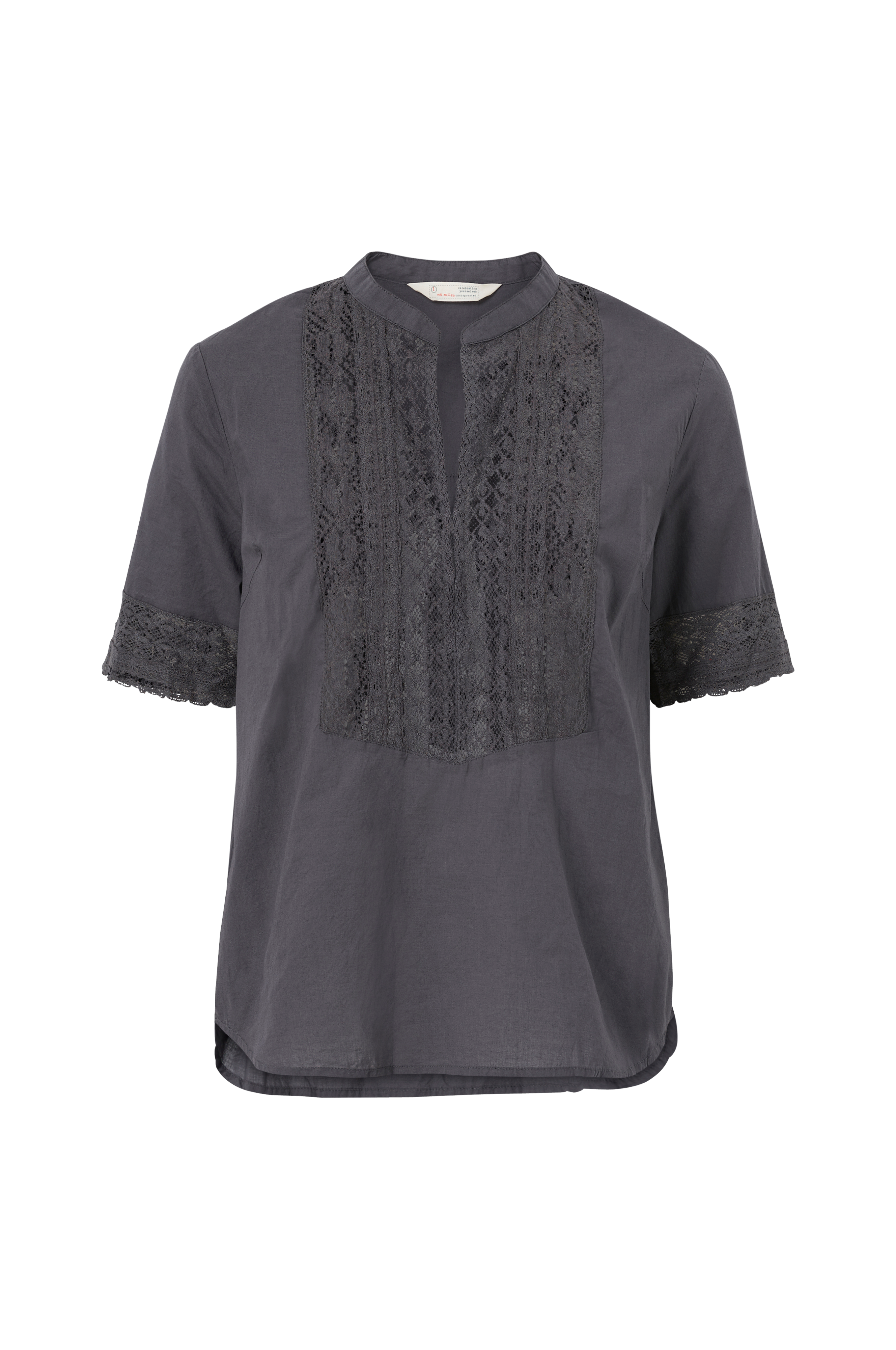 Rak modell i ledig form som har infälld spets på bröstet. Rund hals med påsydd kant och sprund fram samt kort ärm med spets i ärmslut.