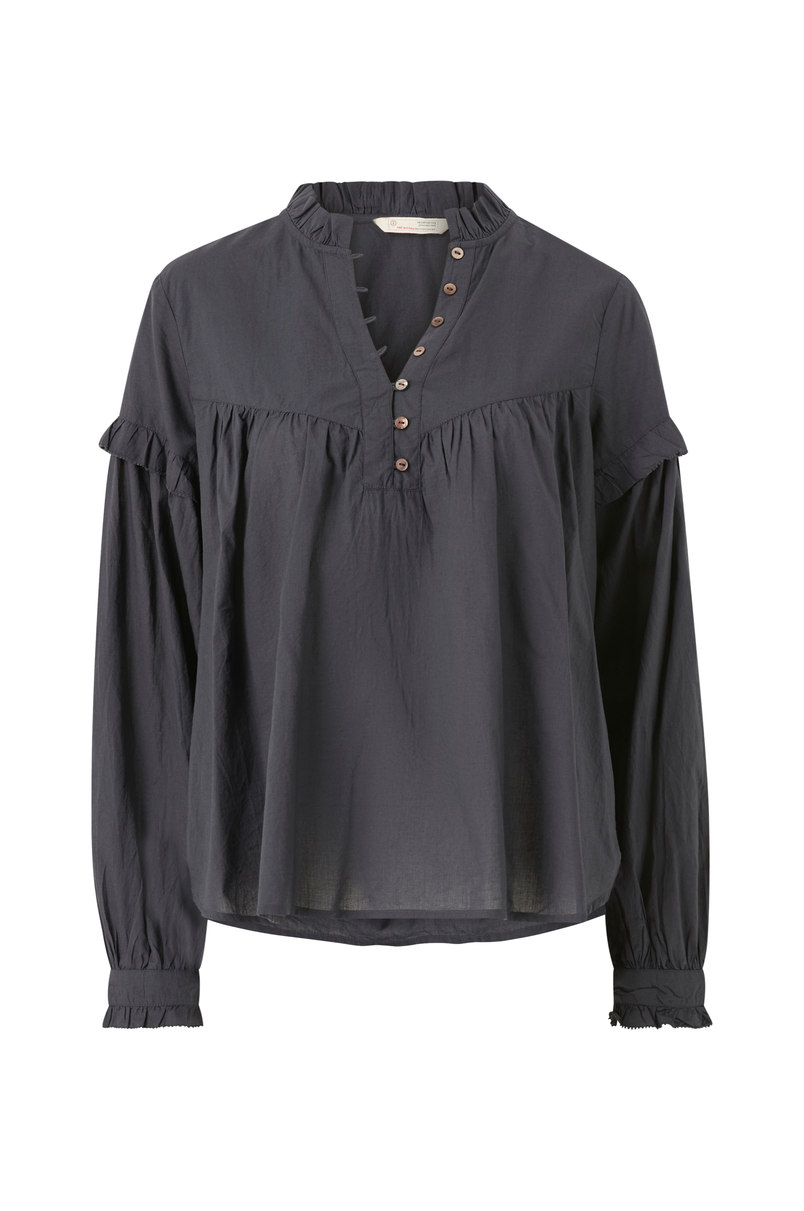 • Vid modell med rynk runt om i brösthöjd • Volang i halsen och i ärmsluten • Knappslå med ögleknäppning • Produkten innehåller ekologisk bomull som är odlad utan kemiska bekämpningsmedel, konstgödsel och genmodifierade grödor (GMO). Det innebär en mer hälsosam arbetsmiljö för bönder och bättre jordmån.
