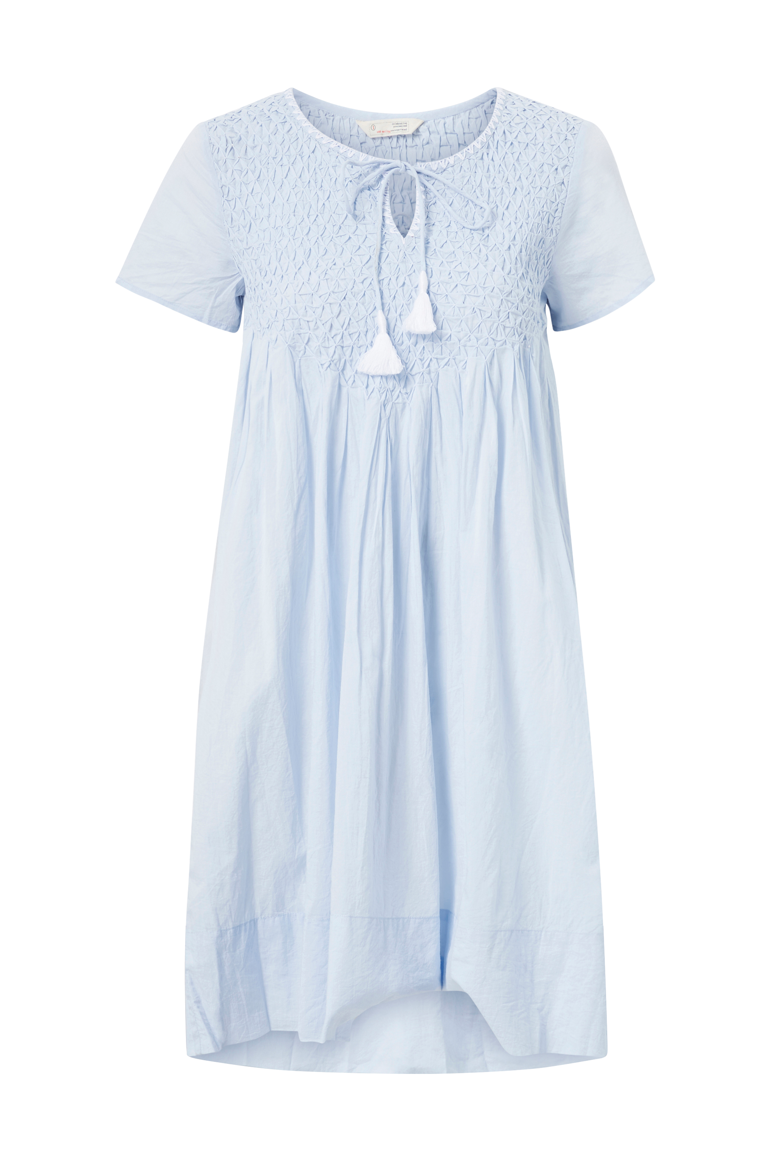 Utsvängd modell med broderier upptill både fram och bak samt rund hals med sprund och långt knyt fram. Kort ärm och små hällor med smalt knytskärp i midjan. Längd ca 94 cm i stl 1.