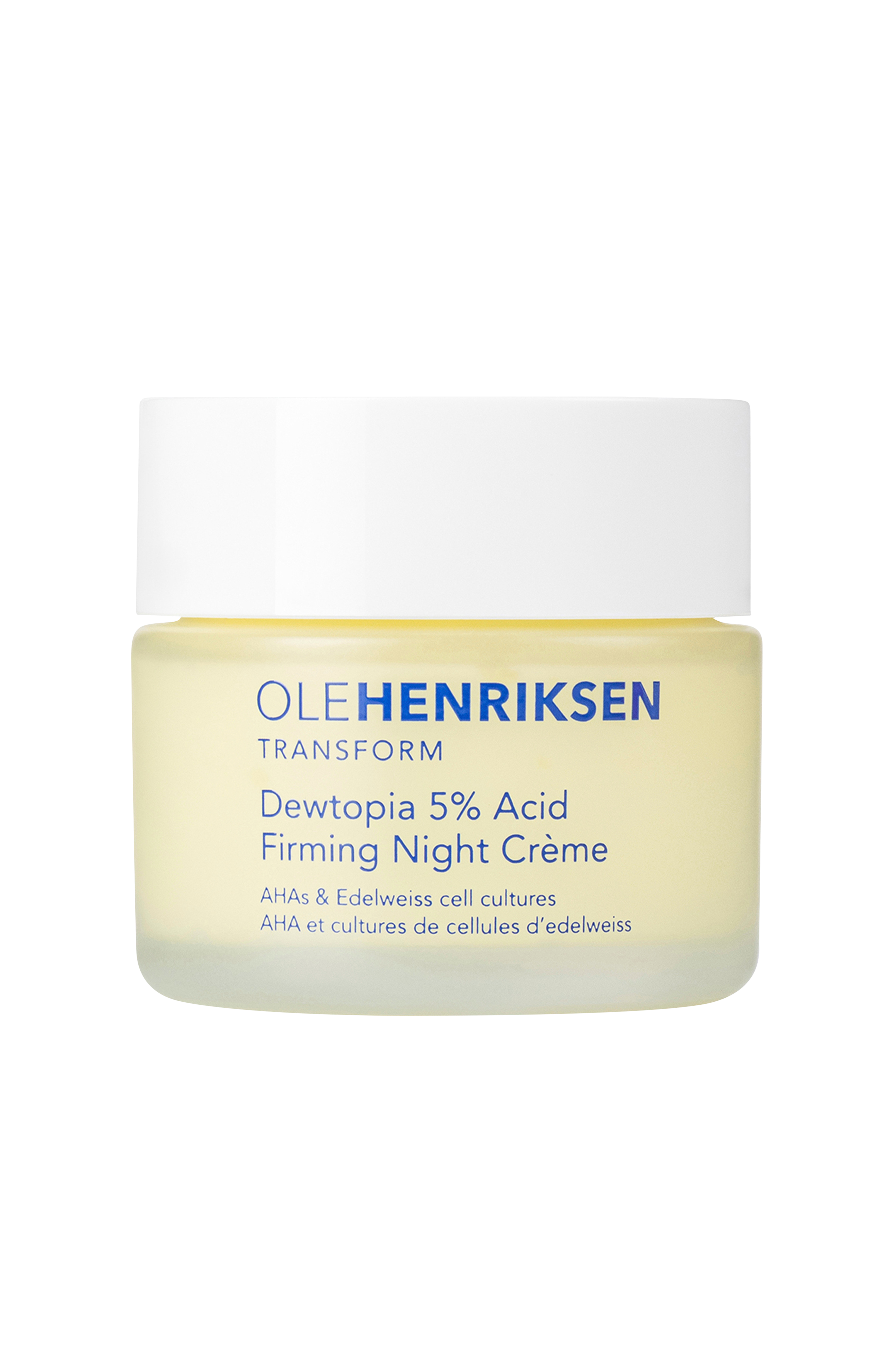 Vakna upp i Dewtopia med fastare, mjukare och en mer plumpad hud. Ole Henriksen bygger vidare på succéserumet Dewtopia™ 20% Acid Night Treatment med en ny hudvårdsprodukt redo att förvandla din hud likt askungen över natten – Dewtopia 5% Acid Firming Night Creme, en potent antiage-nattkräm fylld med hudutjämnande AHA, uppstramande röd alg, rynkbekämpande bakuchiol och ultramjukgörande sheasmör.