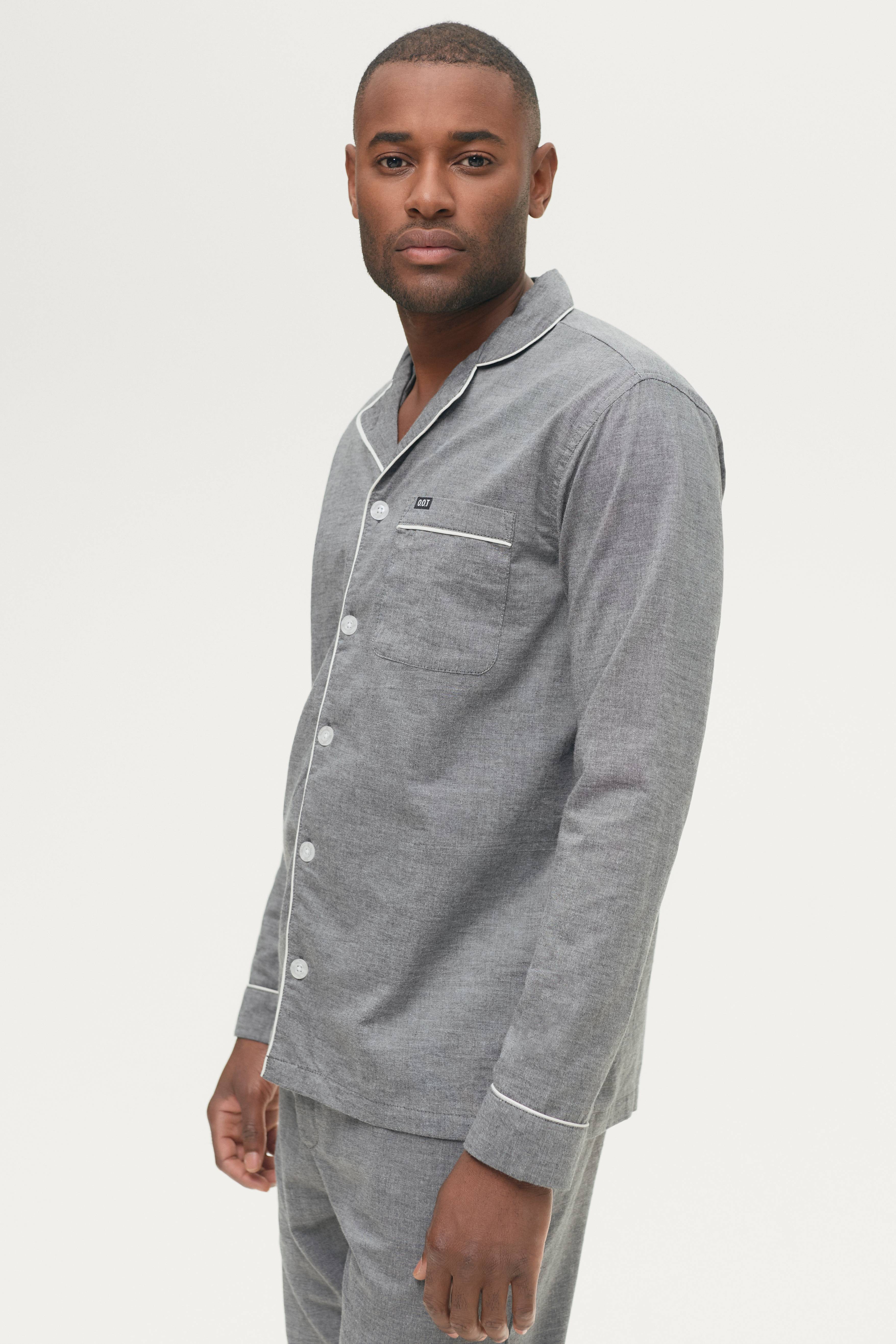 Pyjamas William från On Our Terms med byxor och skjorta i vävd bomullskvalitet. Skjorta med krage och slag, knappar fram och en bröstficka. Byxorna har resårlinning med dragsko och fickor i sidorna.
