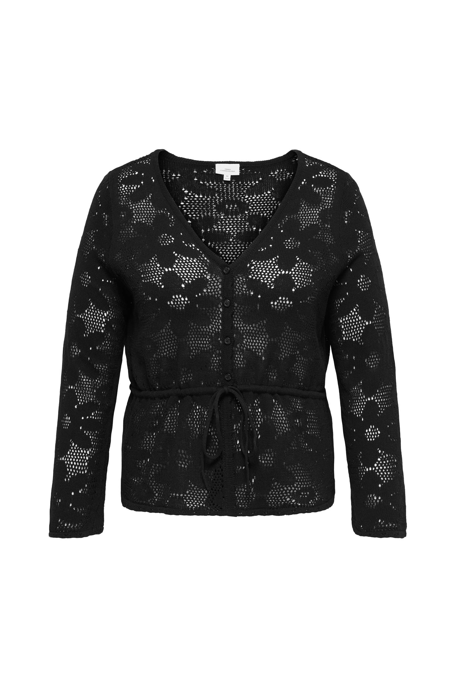 • Stickad cardigan med hålmönster• V-ringning• Knappar fram• Dragsko i midjan• Plusstorlekar